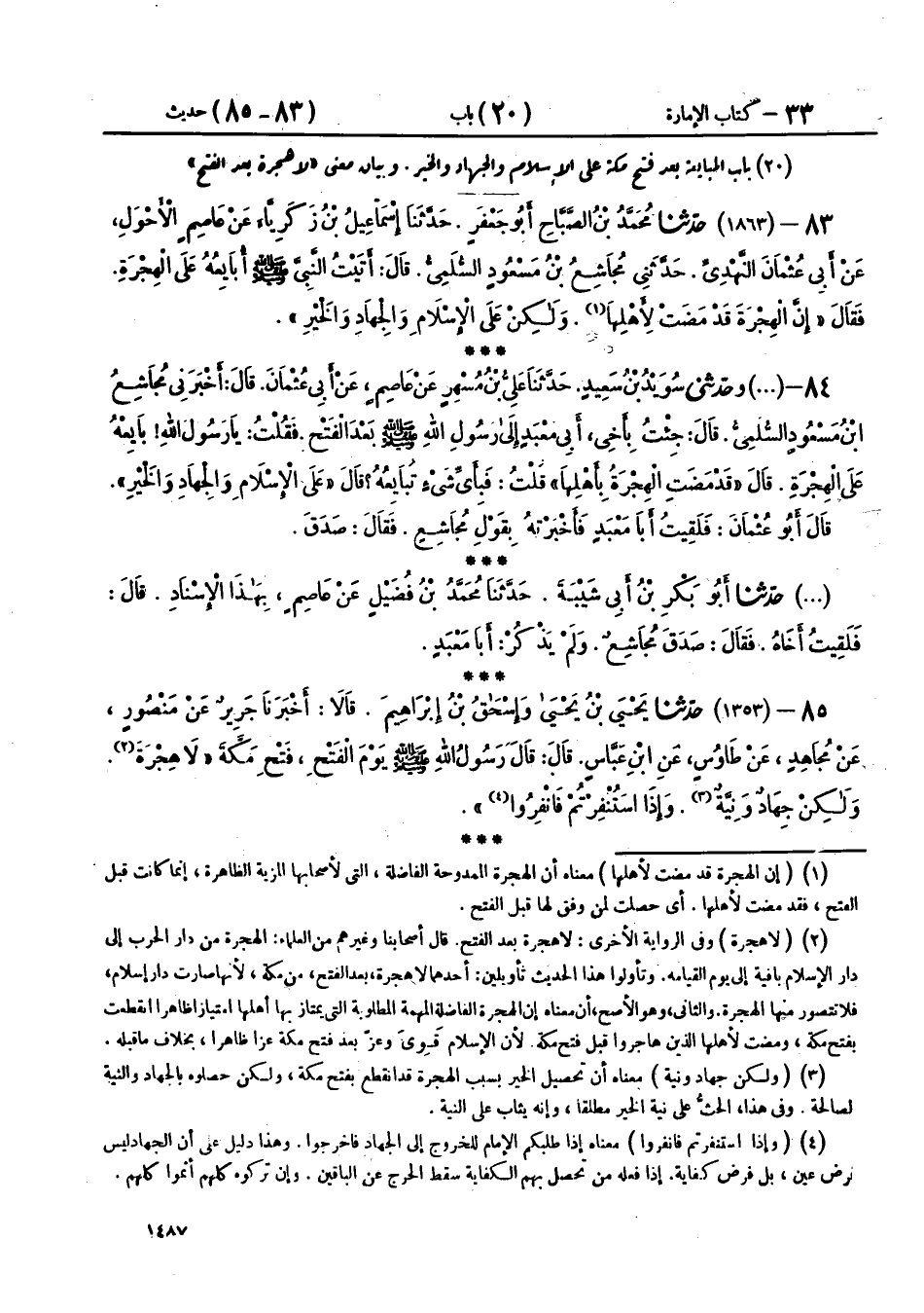 85 - (1353) حَدَّثَنَا يَحْيَى بْنُ يَحْيَى، وَإِسْحَاقُ بْنُ إِبْرَاهِيمَ قَالَا: أَخْبَرَنَا جَرِيرٌ، عَنْ مَنْصُورٍ، عَنْ مُجَاهِدٍ، عَنْ طَاوُسٍ، عَنِ ابْنِ عَبَّاسٍ، قَالَ: قَالَ رَسُولُ اللهِ صَلَّى اللهُ عَلَيْهِ وَسَلَّمَ يَوْمَ الْفَتْحِ - فَتْحِ مَكَّةَ - «§لَا هِجْرَةَ، وَلَكِنْ جِهَادٌ وَنِيَّةٌ، وَإِذَا اسْتُنْفِرْتُمْ فَانْفِرُوا»،
