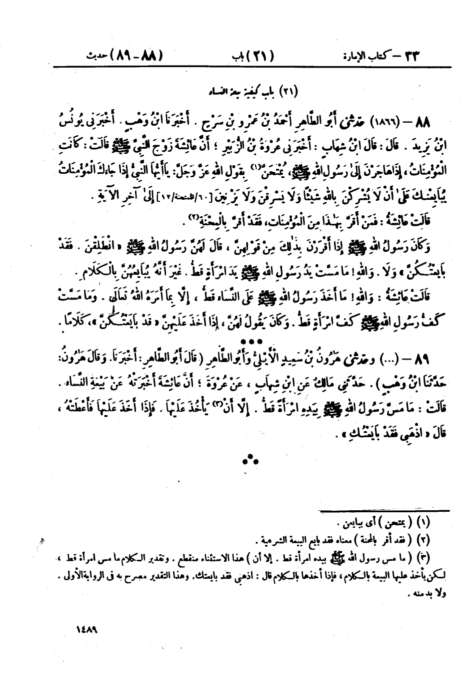 88 - (1866) حَدَّثَنِي أَبُو الطَّاهِرِ أَحْمَدُ بْنُ عَمْرِو بْنِ سَرْحٍ، أَخْبَرَنَا ابْنُ وَهْبٍ، أَخْبَرَنِي يُونُسُ بْنُ يَزِيدَ، قَالَ: قَالَ ابْنُ شِهَابٍ: أَخْبَرَنِي عُرْوَةُ بْنُ الزُّبَيْرِ، أَنَّ عَائِشَةَ، زَوْجَ النَّبِيِّ صَلَّى اللهُ عَلَيْهِ وَسَلَّمَ، قَالَتْ: كَانَتِ الْمُؤْمِنَاتُ إِذَا هَاجَرْنَ إِلَى رَسُولِ اللهِ صَلَّى اللهُ عَلَيْهِ وَسَلَّمَ يُمْتَحَنَّ بِقَوْلِ اللهِ عَزَّ وَجَلَّ: {يَا أَيُّهَا النَّبِيُّ إِذَا جَاءَكَ الْمُؤْمِنَاتُ يُبَايِعْنَكَ عَلَى أَنْ لَا يُشْرِكْنَ بِاللهِ شَيْئًا وَلَا يَسْرِقْنَ وَلَا يَزْنِينَ} [الممتحنة: 12] إِلَى آخِرِ الْآيَةِ، قَالَتْ عَائِشَةُ: فَمَنْ أَقَرَّ بِهَذَا مِنَ الْمُؤْمِنَاتِ، فَقَدْ أَقَرَّ بِالْمِحْنَةِ، وَكَانَ رَسُولُ اللهِ صَلَّى اللهُ عَلَيْهِ وَسَلَّمَ إِذَا أَقْرَرْنَ بِذَلِكَ مِنْ قَوْلِهِنَّ، قَالَ لَهُنَّ رَسُولُ اللهِ صَلَّى اللهُ عَلَيْهِ وَسَلَّمَ: «§انْطَلِقْنَ، فَقَدْ بَايَعْتُكُنَّ» وَلَا وَاللهِ مَا مَسَّتْ يَدُ رَسُولِ اللهِ صَلَّى اللهُ عَلَيْهِ وَسَلَّمَ يَدَ امْرَأَةٍ قَطُّ، غَيْرَ أَنَّهُ يُبَايِعُهُنَّ بِالْكَلَامِ قَالَتْ عَائِشَةُ: وَاللهِ، مَا أَخَذَ رَسُولُ اللهِ صَلَّى اللهُ عَلَيْهِ وَسَلَّمَ عَلَى النِّسَاءِ قَطُّ إِلَّا بِمَا أَمَرَهُ اللهُ تَعَالَى، وَمَا مَسَّتْ كَفُّ رَسُولِ اللهِ صَلَّى اللهُ عَلَيْهِ وَسَلَّمَ كَفَّ امْرَأَةٍ قَطُّ، وَكَانَ يَقُولُ لَهُنَّ إِذَا أَخَذَ عَلَيْهِنَّ: «قَدْ بَايَعْتُكُنَّ» كَلَامًا