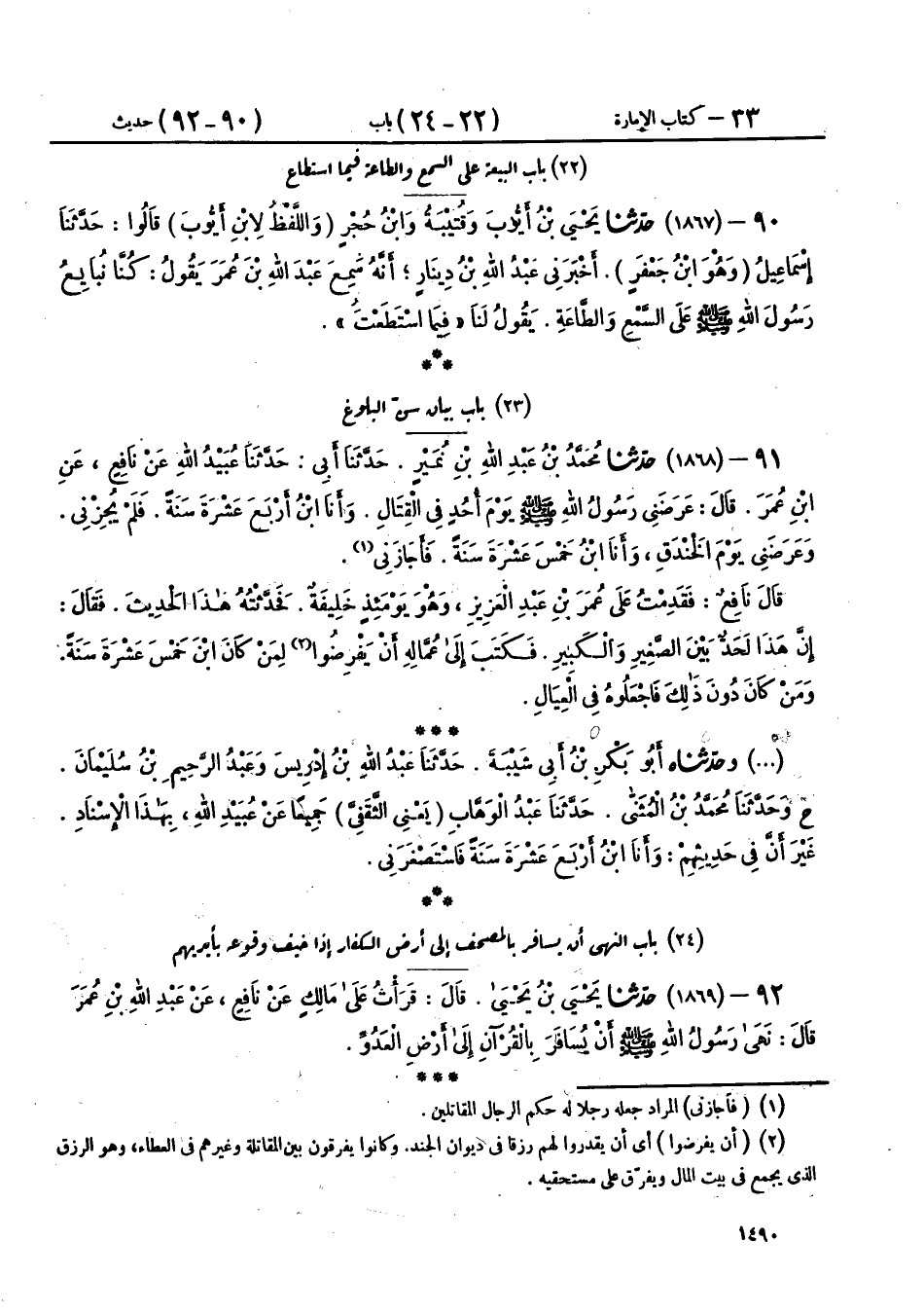 91 - (1868) حَدَّثَنَا مُحَمَّدُ بْنُ عَبْدِ اللهِ بْنِ نُمَيْرٍ، حَدَّثَنَا أَبِي، حَدَّثَنَا عُبَيْدُ اللهِ، عَنْ نَافِعٍ، عَنِ ابْنِ عُمَرَ، قَالَ: " §عَرَضَنِي رَسُولُ اللهِ صَلَّى اللهُ عَلَيْهِ وَسَلَّمَ يَوْمَ أُحُدٍ فِي الْقِتَالِ، وَأَنَا ابْنُ أَرْبَعَ عَشْرَةَ سَنَةً، فَلَمْ يُجِزْنِي، وَعَرَضَنِي يَوْمَ الْخَنْدَقِ، وَأَنَا ابْنُ خَمْسَ عَشْرَةَ سَنَةً، فَأَجَازَنِي، قَالَ نَافِعٌ: فَقَدِمْتُ عَلَى عُمَرَ بْنِ عَبْدِ الْعَزِيزِ وَهُوَ يَوْمَئِذٍ خَلِيفَةٌ، فَحَدَّثْتُهُ هَذَا الْحَدِيثَ، فَقَالَ: «إِنَّ هَذَا لَحَدٌّ بَيْنَ الصَّغِيرِ وَالْكَبِيرِ، فَكَتَبَ إِلَى عُمَّالِهِ أَنْ يَفْرِضُوا لِمَنْ كَانَ ابْنَ خَمْسَ عَشْرَةَ سَنَةً، وَمَنْ كَانَ دُونَ ذَلِكَ فَاجْعَلُوهُ فِي الْعِيَالِ»،