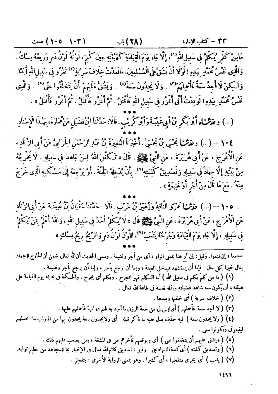 105 - (1876) حَدَّثَنَا عَمْرٌو النَّاقِدُ، وَزُهَيْرُ بْنُ حَرْبٍ، قَالَا: حَدَّثَنَا سُفْيَانُ بْنُ عُيَيْنَةَ، عَنْ أَبِي الزِّنَادِ، عَنِ الْأَعْرَجِ، عَنْ أَبِي هُرَيْرَةَ، عَنِ النَّبِيِّ صَلَّى اللهُ عَلَيْهِ وَسَلَّمَ، قَالَ: «§لَا يُكْلَمُ أَحَدٌ فِي سَبِيلِ اللهِ، وَاللهُ أَعْلَمُ بِمَنْ يُكْلَمُ فِي سَبِيلِهِ، إِلَّا جَاءَ يَوْمَ الْقِيَامَةِ وَجُرْحُهُ يَثْعَبُ، اللَّوْنُ لَوْنُ دَمٍ، وَالرِّيحُ رِيحُ مِسْكٍ»