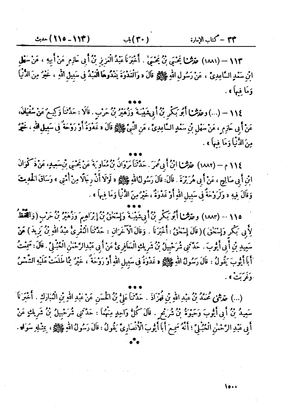 113 - (1881) حَدَّثَنَا يَحْيَى بْنُ يَحْيَى، أَخْبَرَنَا عَبْدُ الْعَزِيزِ بْنُ أَبِي حَازِمٍ، عَنْ أَبِيهِ، عَنْ سَهْلِ بْنِ سَعْدٍ السَّاعِدِيِّ، عَنْ رَسُولِ اللهِ صَلَّى اللهُ عَلَيْهِ وَسَلَّمَ، قَالَ: «§وَالْغَدْوَةَ يَغْدُوهَا الْعَبْدُ فِي سَبِيلِ اللهِ، خَيْرٌ مِنَ الدُّنْيَا وَمَا فِيهَا»