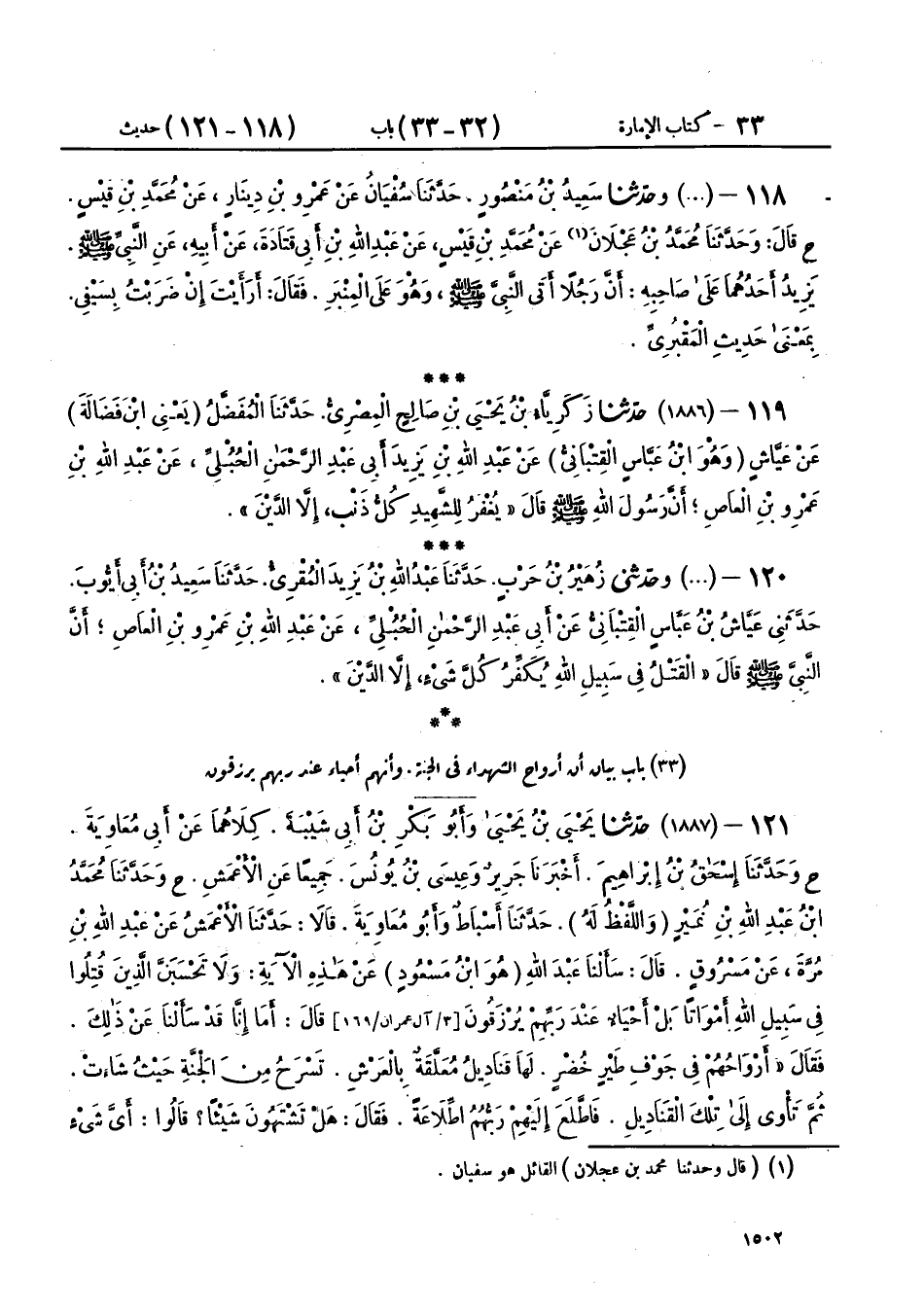121 - (1887) حَدَّثَنَا يَحْيَى بْنُ يَحْيَى، وَأَبُو بَكْرِ بْنُ أَبِي شَيْبَةَ، كِلَاهُمَا عَنْ أَبِي مُعَاوِيَةَ، ح وحَدَّثَنَا إِسْحَاقُ بْنُ إِبْرَاهِيمَ، أَخْبَرَنَا جَرِيرٌ، وَعِيسَى بْنُ يُونُسَ، جَمِيعًا، عَنِ الْأَعْمَشِ، ح وحَدَّثَنَا مُحَمَّدُ بْنُ عَبْدِ اللهِ بْنِ نُمَيْرٍ، وَاللَّفْظُ لَهُ، حَدَّثَنَا أَسْبَاطٌ، وَأَبُو مُعَاوِيَةَ، قَالَا: حَدَّثَنَا الْأَعْمَشُ، عَنْ عَبْدِ اللهِ بْنِ مُرَّةَ، عَنْ مَسْرُوقٍ، قَالَ: سَأَلْنَا عَبْدَ اللهِ عَنْ هَذِهِ الْآيَةِ: {وَلَا تَحْسَبَنَّ الَّذِينَ قُتِلُوا فِي سَبِيلِ اللهِ أَمْوَاتًا بَلْ أَحْيَاءٌ عِنْدَ رَبِّهِمْ يُرْزَقُونَ} [آل عمران: 169] قَالَ: أَمَا إِنَّا قَدْ سَأَلْنَا عَنْ ذَلِكَ، فَقَالَ: «§أَرْوَاحُهُمْ فِي جَوْفِ طَيْرٍ خُضْرٍ، لَهَا قَنَادِيلُ مُعَلَّقَةٌ بِالْعَرْشِ، تَسْرَحُ مِنَ الْجَنَّةِ حَيْثُ شَاءَتْ، ثُمَّ تَأْوِي إِلَى تِلْكَ الْقَنَادِيلِ، فَاطَّلَعَ إِلَيْهِمْ رَبُّهُمُ اطِّلَاعَةً»، فَقَالَ: " هَلْ تَشْتَهُونَ شَيْئًا؟ قَالُوا: أَيَّ شَيْءٍ نَشْتَهِي وَنَحْنُ نَسْرَحُ مِنَ الْجَنَّةِ حَيْثُ شِئْنَا، فَفَعَلَ ذَلِكَ بِهِمْ ثَلَاثَ مَرَّاتٍ، فَلَمَّا رَأَوْا أَنَّهُمْ لَنْ يُتْرَكُوا مِنْ أَنْ يُسْأَلُوا، قَالُوا: يَا رَبِّ، نُرِيدُ أَنْ تَرُدَّ أَرْوَاحَنَا فِي أَجْسَادِنَا حَتَّى نُقْتَلَ فِي سَبِيلِكَ مَرَّةً أُخْرَى، فَلَمَّا رَأَى أَنْ لَيْسَ لَهُمْ حَاجَةٌ تُرِكُوا "