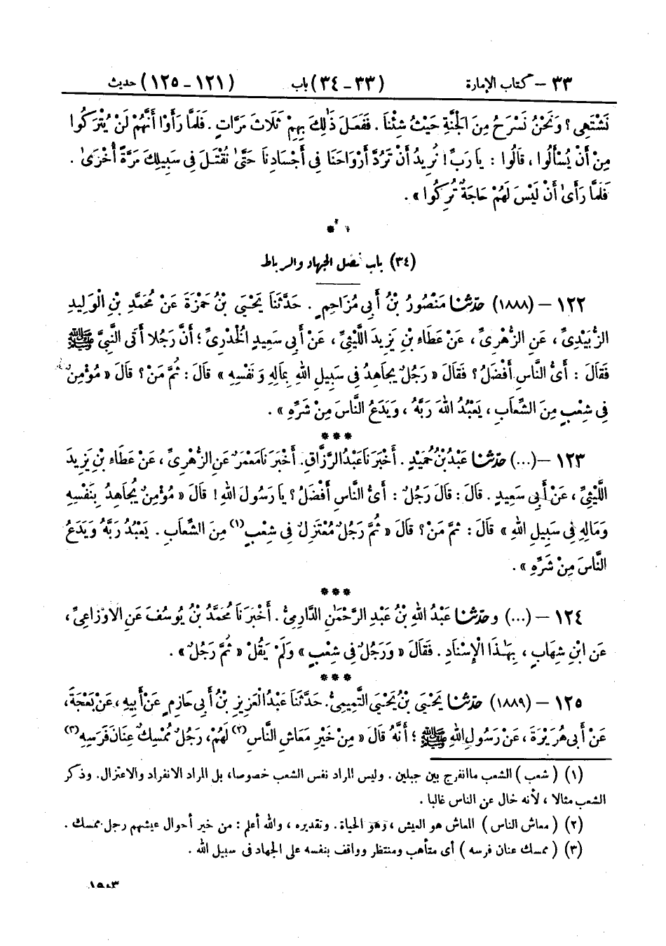 125 - (1889) حَدَّثَنَا يَحْيَى بْنُ يَحْيَى التَّمِيمِيُّ، حَدَّثَنَا عَبْدُ الْعَزِيزِ بْنُ أَبِي حَازِمٍ، عَنْ أَبِيهِ، عَنْ بَعْجَةَ، عَنْ أَبِي هُرَيْرَةَ، عَنْ رَسُولِ اللهِ صَلَّى اللهُ عَلَيْهِ وَسَلَّمَ، أَنَّهُ قَالَ: «§مِنْ خَيْرِ مَعَاشِ النَّاسِ لَهُمْ، رَجُلٌ مُمْسِكٌ عِنَانَ فَرَسِهِ فِي سَبِيلِ اللهِ، يَطِيرُ عَلَى مَتْنِهِ، كُلَّمَا سَمِعَ هَيْعَةً، أَوْ فَزْعَةً طَارَ عَلَيْهِ، يَبْتَغِي الْقَتْلَ وَالْمَوْتَ مَظَانَّهُ، أَوْ رَجُلٌ فِي غُنَيْمَةٍ فِي رَأْسِ شَعَفَةٍ مِنْ هَذِهِ الشَّعَفِ، أَوْ بَطْنِ وَادٍ مِنْ هَذِهِ الْأَوْدِيَةِ، يُقِيمُ الصَّلَاةَ، وَيُؤْتِي الزَّكَاةَ، وَيَعْبُدُ رَبَّهُ حَتَّى يَأْتِيَهُ الْيَقِينُ، لَيْسَ مِنَ النَّاسِ إِلَّا فِي خَيْرٍ»،