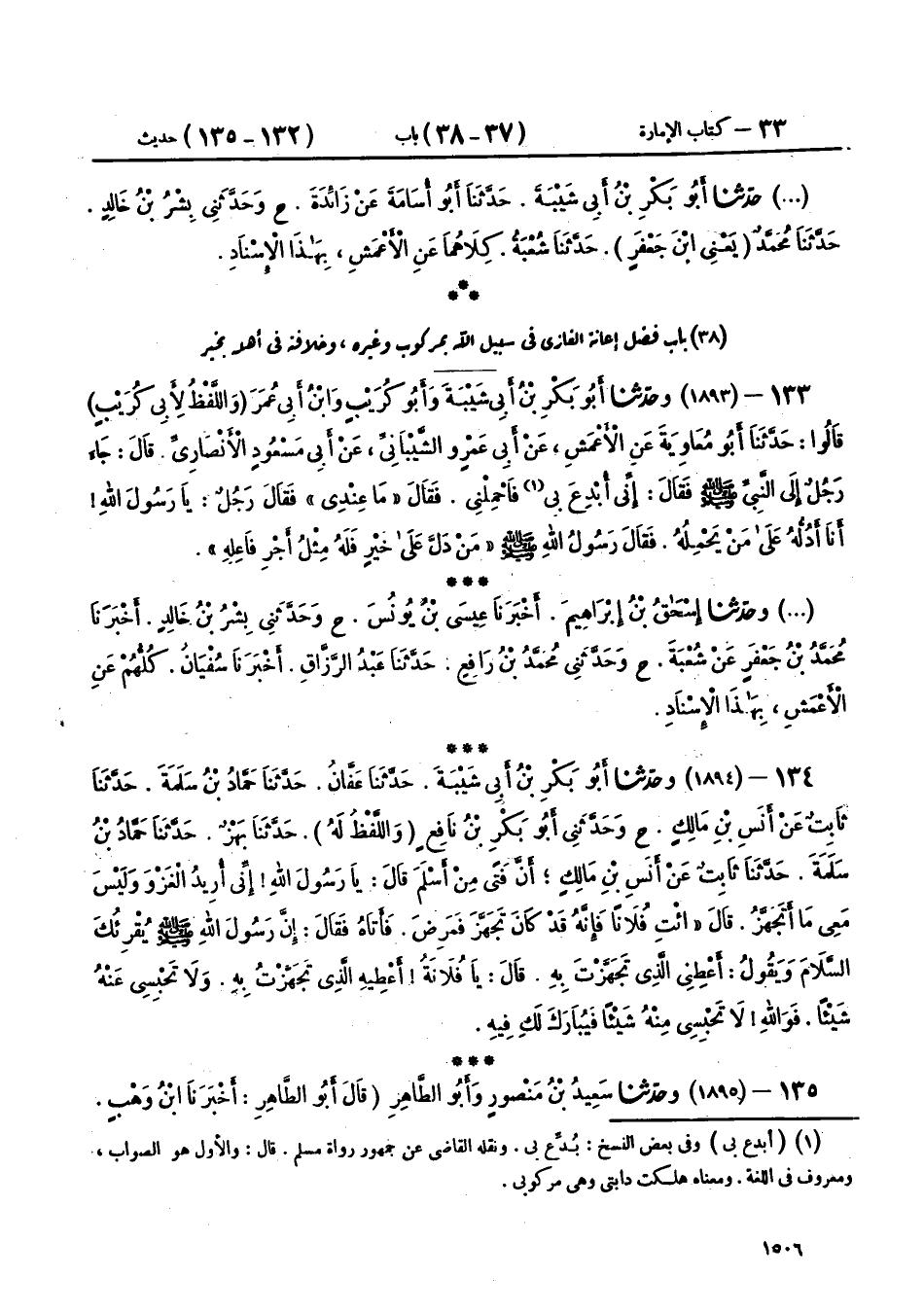 133 - (1893) وحَدَّثَنَا أَبُو بَكْرِ بْنُ أَبِي شَيْبَةَ، وَأَبُو كُرَيْبٍ، وَابْنُ أَبِي عُمَرَ، وَاللَّفْظُ لِأَبِي كُرَيْبٍ، قَالُوا: حَدَّثَنَا أَبُو مُعَاوِيَةَ، عَنِ الْأَعْمَشِ، عَنْ أَبِي عَمْرٍو الشَّيْبَانِيِّ، عَنْ أَبِي مَسْعُودٍ الْأَنْصَارِيِّ، قَالَ: جَاءَ رَجُلٌ إِلَى النَّبِيِّ صَلَّى اللهُ عَلَيْهِ وَسَلَّمَ، فَقَالَ: إِنِّي أُبْدِعَ بِي فَاحْمِلْنِي، فَقَالَ: «مَا عِنْدِي»، فَقَالَ رَجُلٌ: يَا رَسُولَ اللهِ، أَنَا أَدُلُّهُ عَلَى مَنْ يَحْمِلُهُ، فَقَالَ رَسُولُ اللهِ صَلَّى اللهُ عَلَيْهِ وَسَلَّمَ: «§مَنْ دَلَّ عَلَى خَيْرٍ فَلَهُ مِثْلُ أَجْرِ فَاعِلِهِ»،