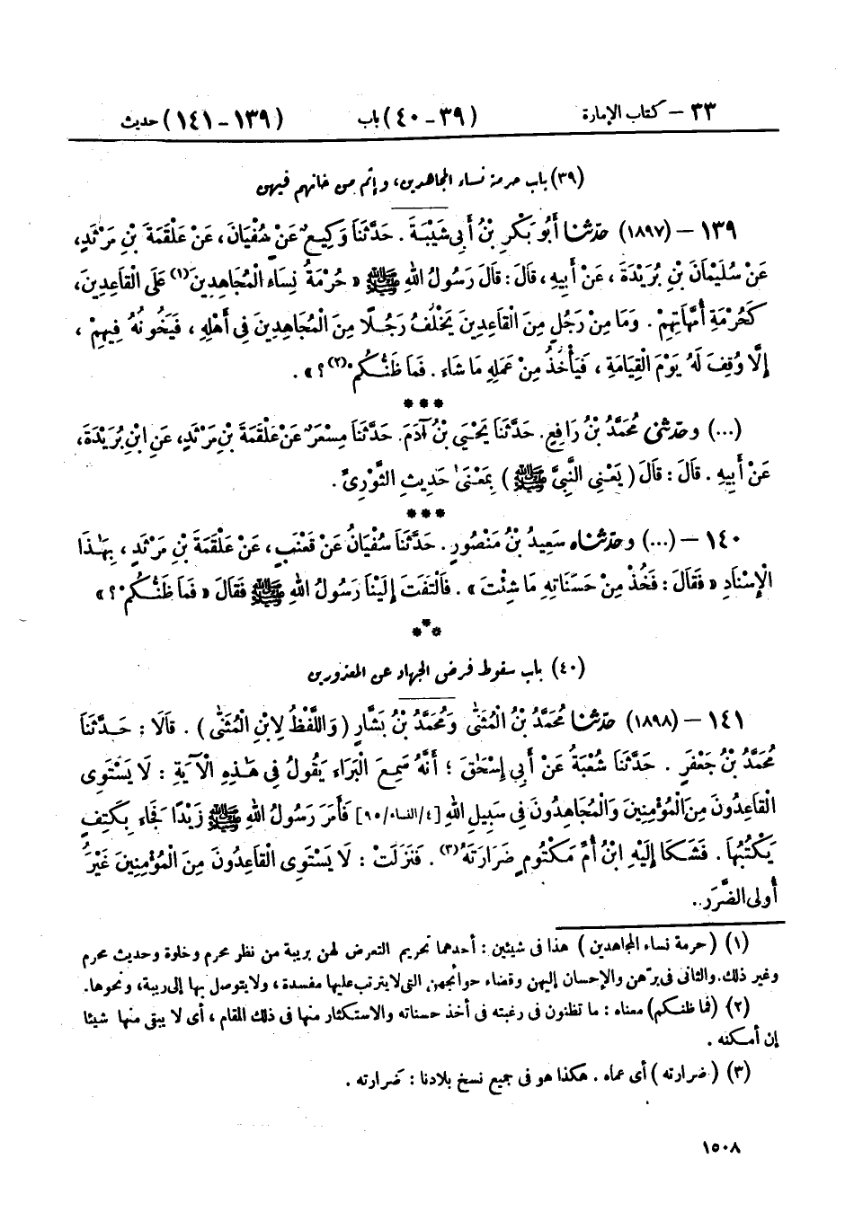 139 - (1897) حَدَّثَنَا أَبُو بَكْرِ بْنُ أَبِي شَيْبَةَ، حَدَّثَنَا وَكِيعٌ، عَنْ سُفْيَانَ، عَنْ عَلْقَمَةَ بْنِ مَرْثَدٍ، عَنْ سُلَيْمَانَ بْنِ بُرَيْدَةَ، عَنْ أَبِيهِ، قَالَ: قَالَ رَسُولُ اللهِ صَلَّى اللهُ عَلَيْهِ وَسَلَّمَ: «§حُرْمَةُ نِسَاءِ الْمُجَاهِدِينَ عَلَى الْقَاعِدِينَ كَحُرْمَةِ أُمَّهَاتِهِمْ، وَمَا مِنْ رَجُلٍ مِنَ الْقَاعِدِينَ يَخْلُفُ رَجُلًا مِنَ الْمُجَاهِدِينَ فِي أَهْلِهِ فَيَخُونُهُ فِيهِمْ، إِلَّا وُقِفَ لَهُ يَوْمَ الْقِيَامَةِ، فَيَأْخُذُ مِنْ عَمَلِهِ مَا شَاءَ، فَمَا ظَنُّكُمْ؟»،