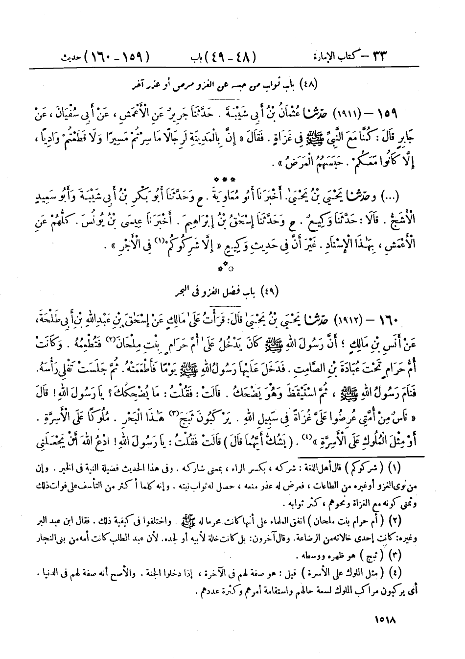 160 - (1912) حَدَّثَنَا يَحْيَى بْنُ يَحْيَى، قَالَ: قَرَأْتُ عَلَى مَالِكٍ، عَنْ إِسْحَاقَ بْنِ عَبْدِ اللهِ بْنِ أَبِي طَلْحَةَ، عَنْ أَنَسِ بْنِ مَالِكٍ، أَنَّ رَسُولَ اللهِ صَلَّى اللهُ عَلَيْهِ وَسَلَّمَ كَانَ يَدْخُلُ عَلَى أُمِّ حَرَامٍ بِنْتِ مِلْحَانَ فَتُطْعِمُهُ، وَكَانَتْ أُمُّ حَرَامٍ تَحْتَ عُبَادَةَ بْنِ الصَّامِتِ، فَدَخَلَ عَلَيْهَا رَسُولُ اللهِ صَلَّى اللهُ عَلَيْهِ وَسَلَّمَ يَوْمًا، فَأَطْعَمَتْهُ، ثُمَّ جَلَسَتْ تَفْلِي رَأْسَهُ، فَنَامَ رَسُولُ اللهِ صَلَّى اللهُ عَلَيْهِ وَسَلَّمَ، ثُمَّ اسْتَيْقَظَ وَهُوَ يَضْحَكُ، قَالَتْ: فَقُلْتُ: مَا يُضْحِكُكَ يَا رَسُولَ اللهِ؟ قَالَ: «§نَاسٌ مِنْ أُمَّتِي عُرِضُوا عَلَيَّ، غُزَاةً فِي سَبِيلِ اللهِ، يَرْكَبُونَ ثَبَجَ هَذَا الْبَحْرِ، مُلُوكًا عَلَى الْأَسِرَّةِ»، أَوْ «مِثْلَ الْمُلُوكِ عَلَى الْأَسِرَّةِ» - يَشُكُّ أَيَّهُمَا - قَالَ: قَالَتْ: فَقُلْتُ: يَا رَسُولَ اللهِ، ادْعُ اللهَ أَنْ يَجْعَلَنِي مِنْهُمْ، فَدَعَا لَهَا، ثُمَّ وَضَعَ رَأْسَهُ، فَنَامَ، ثُمَّ اسْتَيْقَظَ وَهُوَ يَضْحَكُ، قَالَتْ: فَقُلْتُ: مَا يُضْحِكُكَ يَا رَسُولَ اللهِ؟ قَالَ: «نَاسٌ مِنْ أُمَّتِي عُرِضُوا عَلَيَّ، غُزَاةً فِي سَبِيلِ اللهِ»، كَمَا قَالَ فِي الْأُولَى، قَالَتْ: فَقُلْتُ: يَا رَسُولَ اللهِ، ادْعُ اللهَ أَنْ يَجْعَلَنِي مِنْهُمْ، قَالَ: «أَنْتِ مِنَ الْأَوَّلِينَ»، فَرَكِبَتْ أُمُّ حَرَامٍ بِنْتُ مِلْحَانَ الْبَحْرَ فِي زَمَنِ مُعَاوِيَةَ، فَصُرِعَتْ عَنْ دَابَّتِهَا حِينَ خَرَجَتْ مِنَ الْبَحْرِ، فَهَلَكَتْ
