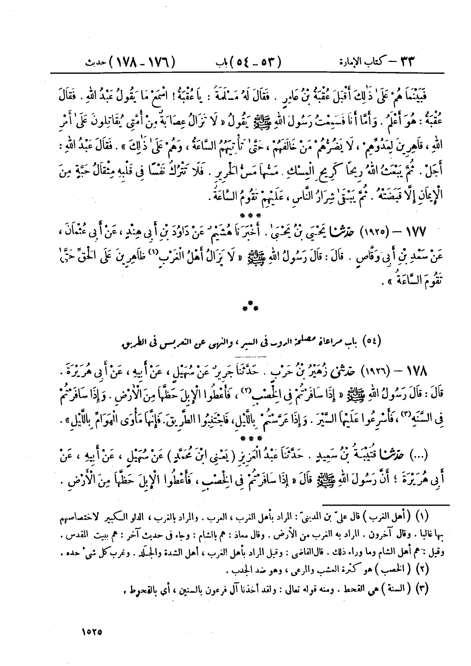 (1926) - حَدَّثَنَا قُتَيْبَةُ بْنُ سَعِيدٍ، حَدَّثَنَا عَبْدُ الْعَزِيزِ يَعْنِي ابْنَ مُحَمَّدٍ، عَنْ سُهَيْلٍ، عَنْ أَبِيهِ، عَنْ أَبِي هُرَيْرَةَ، أَنَّ رَسُولَ اللهِ صَلَّى اللهُ عَلَيْهِ وَسَلَّمَ قَالَ: «§إِذَا سَافَرْتُمْ فِي الْخِصْبِ، فَأَعْطُوا الْإِبِلَ حَظَّهَا مِنَ الْأَرْضِ، وَإِذَا سَافَرْتُمْ فِي السَّنَةِ، فَبَادِرُوا بِهَا نِقْيَهَا، وَإِذَا عَرَّسْتُمْ، فَاجْتَنِبُوا الطَّرِيقَ، فَإِنَّهَا طُرُقُ الدَّوَابِّ، وَمَأْوَى الْهَوَامِّ بِاللَّيْلِ»