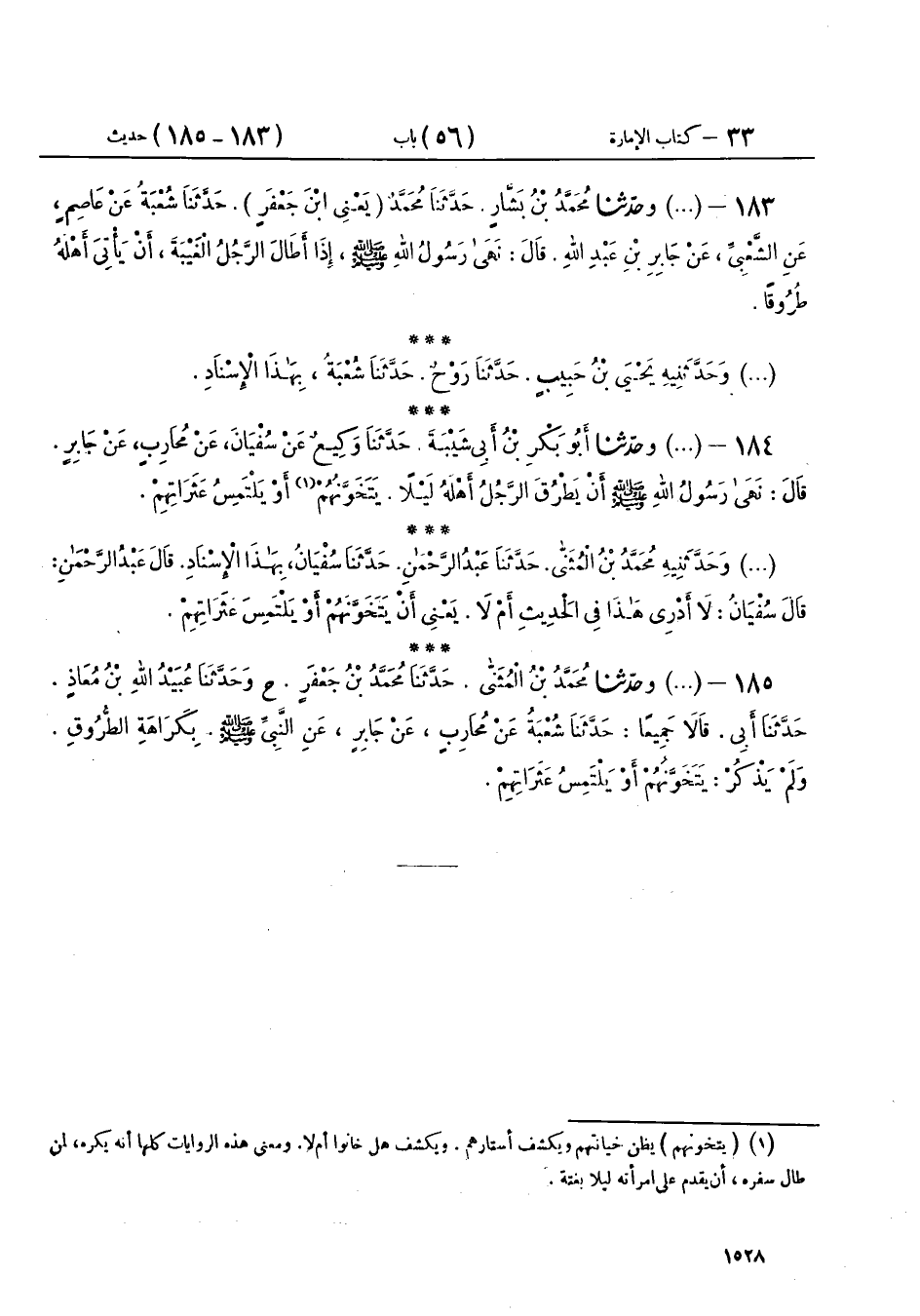 185 - (715) وحَدَّثَنَا مُحَمَّدُ بْنُ الْمُثَنَّى، حَدَّثَنَا مُحَمَّدُ بْنُ جَعْفَرٍ، ح وحَدَّثَنَا عُبَيْدُ اللهِ بْنُ مُعَاذٍ، حَدَّثَنَا أَبِي، قَالَا جَمِيعًا: حَدَّثَنَا شُعْبَةُ، عَنْ مُحَارِبٍ، عَنْ جَابِرٍ، عَنِ النَّبِيِّ صَلَّى اللهُ عَلَيْهِ وَسَلَّمَ بِكَرَاهَةِ الطُّرُوقِ، وَلَمْ يَذْكُرْ: يَتَخَوَّنُهُمْ، أَوْ يَلْتَمِسُ عَثَرَاتِهِمْ