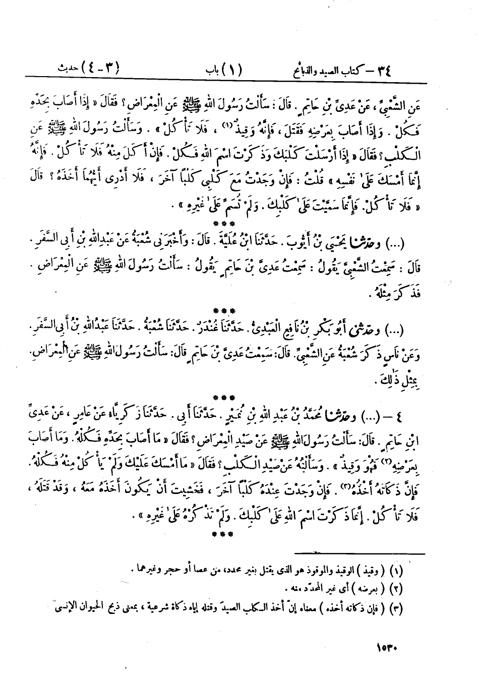 4 - (1929) وحَدَّثَنَا مُحَمَّدُ بْنُ عَبْدِ اللهِ بْنِ نُمَيْرٍ، حَدَّثَنَا أَبِي، حَدَّثَنَا زَكَرِيَّا، عَنْ عَامِرٍ، عَنْ عَدِيِّ بْنِ حَاتِمٍ، قَالَ: سَأَلْتُ رَسُولَ اللهِ صَلَّى اللهُ عَلَيْهِ وَسَلَّمَ، عَنْ صَيْدِ الْمِعْرَاضِ، فَقَالَ: «§مَا أَصَابَ بِحَدِّهِ فَكُلْهُ، وَمَا أَصَابَ بِعَرْضِهِ فَهُوَ وَقِيذٌ»، وَسَأَلْتُهُ عَنْ صَيْدِ الْكَلْبِ، فَقَالَ: «مَا أَمْسَكَ عَلَيْكَ وَلَمْ يَأْكُلْ مِنْهُ فَكُلْهُ، فَإِنَّ ذَكَاتَهُ أَخْذُهُ، فَإِنْ وَجَدْتَ عِنْدَهُ كَلْبًا آخَرَ، فَخَشِيتَ أَنْ يَكُونَ أَخَذَهُ مَعَهُ وَقَدْ قَتَلَهُ، فَلَا تَأْكُلْ، إِنَّمَا ذَكَرْتَ اسْمَ اللهِ عَلَى كَلْبِكَ، وَلَمْ تَذْكُرْهُ عَلَى غَيْرِهِ»،