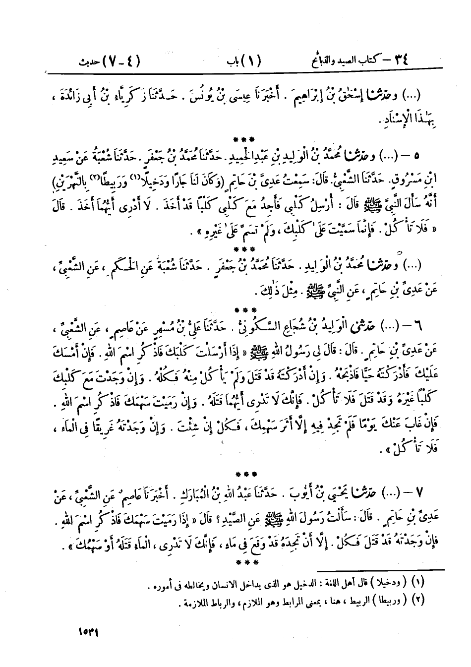 6 - (1929) حَدَّثَنِي الْوَلِيدُ بْنُ شُجَاعٍ السَّكُونِيُّ، حَدَّثَنَا عَلِيُّ بْنُ مُسْهِرٍ، عَنْ عَاصِمٍ، عَنِ الشَّعْبِيِّ، عَنْ عَدِيِّ بْنِ حَاتِمٍ، قَالَ: قَالَ لِي رَسُولُ اللهِ صَلَّى اللهُ عَلَيْهِ وَسَلَّمَ: «§إِذَا أَرْسَلْتَ كَلْبَكَ فَاذْكُرِ اسْمَ اللهِ، فَإِنْ أَمْسَكَ عَلَيْكَ، فَأَدْرَكْتَهُ حَيًّا فَاذْبَحْهُ، وَإِنْ أَدْرَكْتَهُ قَدْ قَتَلَ، وَلَمْ يَأْكُلْ مِنْهُ فَكُلْهُ، وَإِنْ وَجَدْتَ مَعَ كَلْبِكَ كَلْبًا غَيْرَهُ، وَقَدْ قَتَلَ فَلَا تَأْكُلْ، فَإِنَّكَ لَا تَدْرِي أَيُّهُمَا قَتَلَهُ، وَإِنْ رَمَيْتَ سَهْمَكَ، فَاذْكُرِ اسْمَ اللهِ، فَإِنْ غَابَ عَنْكَ يَوْمًا، فَلَمْ تَجِدْ فِيهِ إِلَّا أَثَرَ سَهْمِكَ، فَكُلْ إِنْ شِئْتَ، وَإِنْ وَجَدْتَهُ غَرِيقًا فِي الْمَاءِ، فَلَا تَأْكُلْ»