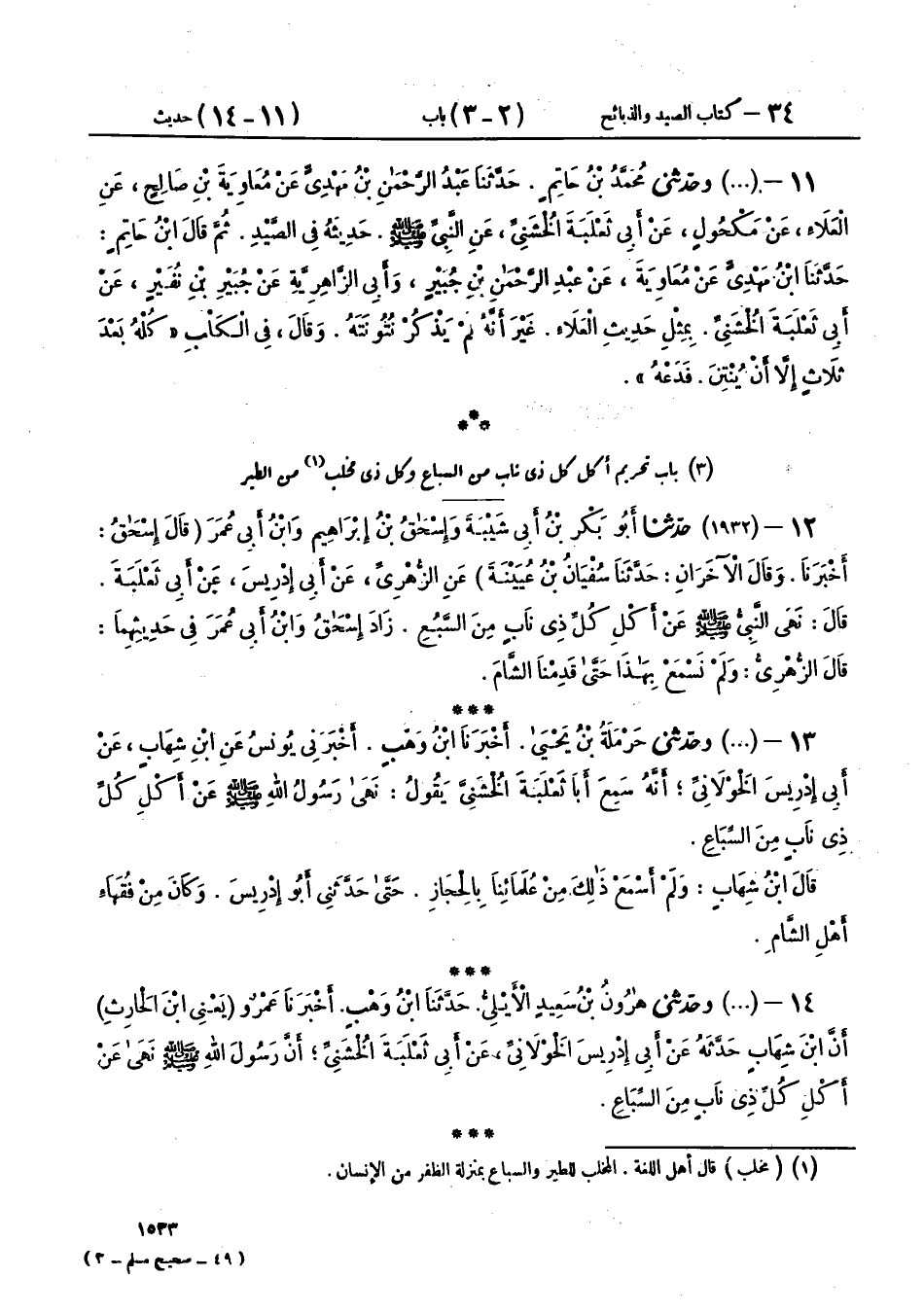 14 - (1932) وحَدَّثَنِي هَارُونُ بْنُ سَعِيدٍ الْأَيْلِيُّ، حَدَّثَنَا ابْنُ وَهْبٍ، أَخْبَرَنَا عَمْرٌو يَعْنِي ابْنَ الْحَارِثِ، أَنَّ ابْنَ شِهَابٍ، حَدَّثَهُ، عَنْ أَبِي إِدْرِيسَ الْخَوْلَانِيِّ، عَنْ أَبِي ثَعْلَبَةَ الْخُشَنِيِّ، «أَنَّ رَسُولَ اللهِ صَلَّى اللهُ عَلَيْهِ وَسَلَّمَ §نَهَى عَنْ أَكْلِ كُلِّ ذِي نَابٍ مِنَ السِّبَاعِ»،