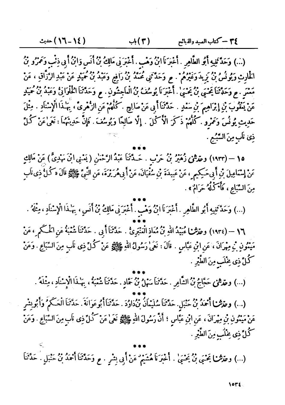 (1932) - وحَدَّثَنِيهِ أَبُو الطَّاهِرِ، أَخْبَرَنَا ابْنُ وَهْبٍ، أَخْبَرَنِي مَالِكُ بْنُ أَنَسٍ، وَابْنُ أَبِي ذِئْبٍ، وَعَمْرُو بْنُ الْحَارِثِ، وَيُونُسُ بْنُ يَزِيدَ، وَغَيْرُهُمْ، ح وحَدَّثَنِي مُحَمَّدُ بْنُ رَافِعٍ، وَعَبْدُ بْنُ حُمَيْدٍ، عَنْ عَبْدِ الرَّزَّاقِ، عَنْ مَعْمَرٍ، ح وحَدَّثَنَا يَحْيَى بْنُ يَحْيَى، أَخْبَرَنَا يُوسُفُ بْنُ الْمَاجِشُونِ، ح وحَدَّثَنَا الْحُلْوَانِيُّ، وَعَبْدُ بْنُ حُمَيْدٍ، عَنْ يَعْقُوبَ بْنِ إِبْرَاهِيمَ بْنِ سَعْدٍ، حَدَّثَنَا أَبِي، عَنْ صَالِحٍ، كُلُّهُمْ عَنِ الزُّهْرِيِّ، بِهَذَا الْإِسْنَادِ مِثْلَ حَدِيثِ يُونُسَ، وَعَمْرٍو، كُلُّهُمْ ذَكَرَ الْأَكْلَ إِلَّا صَالِحًا، وَيُوسُفَ، فَإِنَّ حَدِيثَهُمَا نَهَى عَنْ كُلِّ ذِي نَابٍ مِنَ السَّبُعِ
