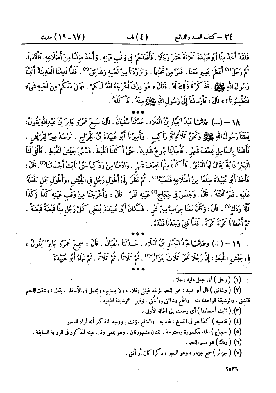 19 - (1935) وحَدَّثَنَا عَبْدُ الْجَبَّارِ بْنُ الْعَلَاءِ، حَدَّثَنَا سُفْيَانُ، قَالَ: سَمِعَ عَمْرٌو، جَابِرًا، يَقُولُ فِي جَيْشِ الْخَبَطِ: «إِنَّ §رَجُلًا نَحَرَ ثَلَاثَ جَزَائِرَ، ثُمَّ ثَلَاثًا، ثُمَّ نَهَاهُ أَبُو عُبَيْدَةَ»