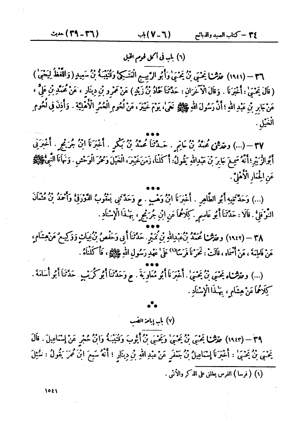 36 - (1941) حَدَّثَنَا يَحْيَى بْنُ يَحْيَى، وَأَبُو الرَّبِيعِ الْعَتَكِيُّ، وَقُتَيْبَةُ بْنُ سَعِيدٍ، وَاللَّفْظُ لِيَحْيَى، قَالَ يَحْيَى: أَخْبَرَنَا، وقَالَ الْآخَرَانِ: حَدَّثَنَا حَمَّادُ بْنُ زَيْدٍ، عَنْ عَمْرِو بْنِ دِينَارٍ، عَنْ مُحَمَّدِ بْنِ عَلِيٍّ، عَنْ جَابِرِ بْنِ عَبْدِ اللهِ، «أَنَّ رَسُولَ اللهِ صَلَّى اللهُ عَلَيْهِ وَسَلَّمَ §نَهَى يَوْمَ خَيْبَرَ عَنْ لُحُومِ الْحُمُرِ الْأَهْلِيَّةِ، وَأَذِنَ فِي لُحُومِ الْخَيْلِ»