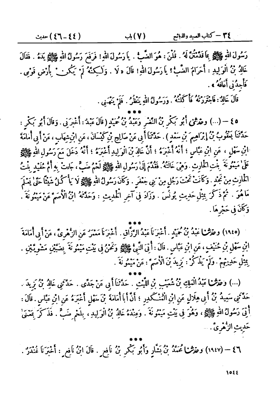 45 - (1946) وحَدَّثَنِي أَبُو بَكْرِ بْنُ النَّضْرِ، وَعَبْدُ بْنُ حُمَيْدٍ، قَالَ عَبْدٌ: أَخْبَرَنِي، وقَالَ أَبُو بَكْرٍ: حَدَّثَنَا يَعْقُوبُ بْنُ إِبْرَاهِيمَ بْنِ سَعْدٍ، حَدَّثَنَا أَبِي، عَنْ صَالِحِ بْنِ كَيْسَانَ، عَنِ ابْنِ شِهَابٍ، عَنْ أَبِي أُمَامَةَ بْنِ سَهْلٍ، عَنِ ابْنِ عَبَّاسٍ، أَنَّهُ أَخْبَرَهُ أَنَّ خَالِدَ بْنَ الْوَلِيدِ، أَخْبَرَهُ، أَنَّهُ دَخَلَ مَعَ رَسُولِ اللهِ صَلَّى اللهُ عَلَيْهِ وَسَلَّمَ عَلَى مَيْمُونَةَ بِنْتِ الْحَارِثِ وَهِيَ خَالَتُهُ، فَقُدِّمَ إِلَى رَسُولِ اللهِ صَلَّى اللهُ عَلَيْهِ وَسَلَّمَ لَحْمُ ضَبٍّ جَاءَتْ بِهِ أُمُّ حُفَيْدٍ بِنْتُ الْحَارِثِ مِنْ نَجْدٍ، وَكَانَتْ تَحْتَ رَجُلٍ مِنْ بَنِي جَعْفَرٍ، وَكَانَ رَسُولُ اللهِ صَلَّى اللهُ عَلَيْهِ وَسَلَّمَ لَا يَأْكُلُ شَيْئًا حَتَّى يَعْلَمَ مَا هُوَ، ثُمَّ ذَكَرَ بِمِثْلِ حَدِيثِ يُونُسَ، وَزَادَ فِي آخِرِ الْحَدِيثِ: وَحَدَّثَهُ ابْنُ الْأَصَمِّ، عَنْ مَيْمُونَةَ وَكَانَ فِي حَجْرِهَا،