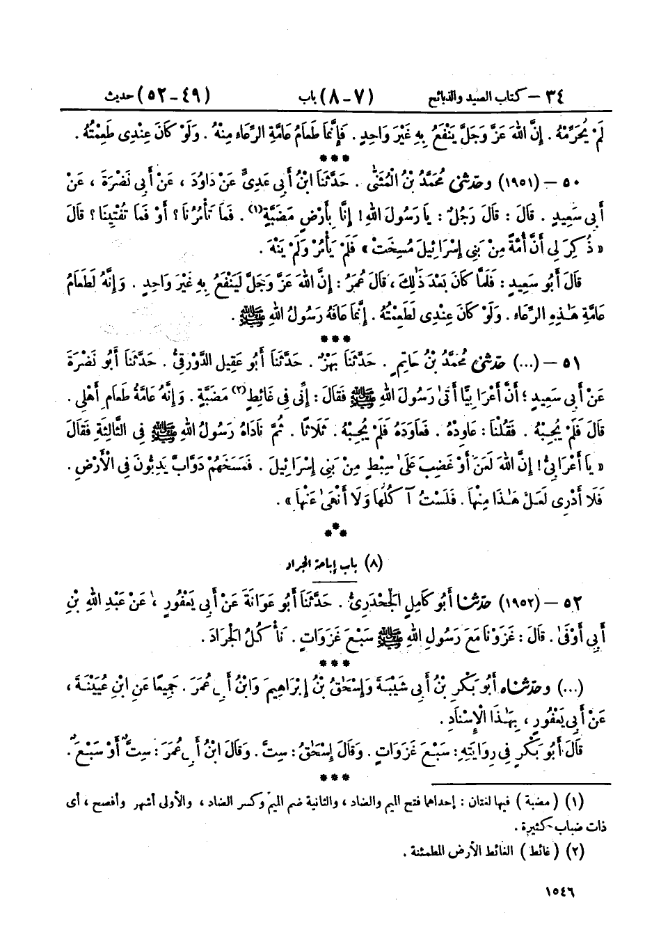 52 - (1952) حَدَّثَنَا أَبُو كَامِلٍ الْجَحْدَرِيُّ، حَدَّثَنَا أَبُو عَوَانَةَ، عَنْ أَبِي يَعْفُورٍ، عَنْ عَبْدِ اللهِ بْنِ أَبِي أَوْفَى، قَالَ: «§غَزَوْنَا مَعَ رَسُولِ اللهِ صَلَّى اللهُ عَلَيْهِ وَسَلَّمَ سَبْعَ غَزَوَاتٍ نَأْكُلُ الْجَرَادَ»،