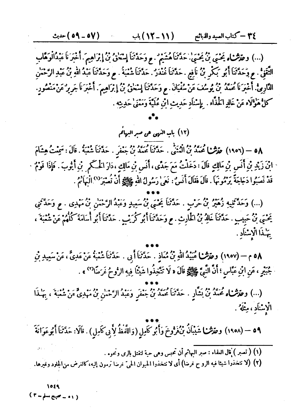 58 - (1956) حَدَّثَنَا مُحَمَّدُ بْنُ الْمُثَنَّى، حَدَّثَنَا مُحَمَّدُ بْنُ جَعْفَرٍ، حَدَّثَنَا شُعْبَةُ، قَالَ: سَمِعْتُ هِشَامَ بْنَ زَيْدِ بْنِ أَنَسِ بْنِ مَالِكٍ، قَالَ: دَخَلْتُ مَعَ جَدِّي أَنَسِ بْنِ مَالِكٍ دَارَ الْحَكَمِ بْنِ أَيُّوبَ، فَإِذَا قَوْمٌ قَدْ نَصَبُوا دَجَاجَةً يَرْمُونَهَا، قَالَ: فَقَالَ أَنَسٌ: «§نَهَى رَسُولُ اللهِ صَلَّى اللهُ عَلَيْهِ وَسَلَّمَ أَنْ تُصْبَرَ الْبَهَائِمُ»،