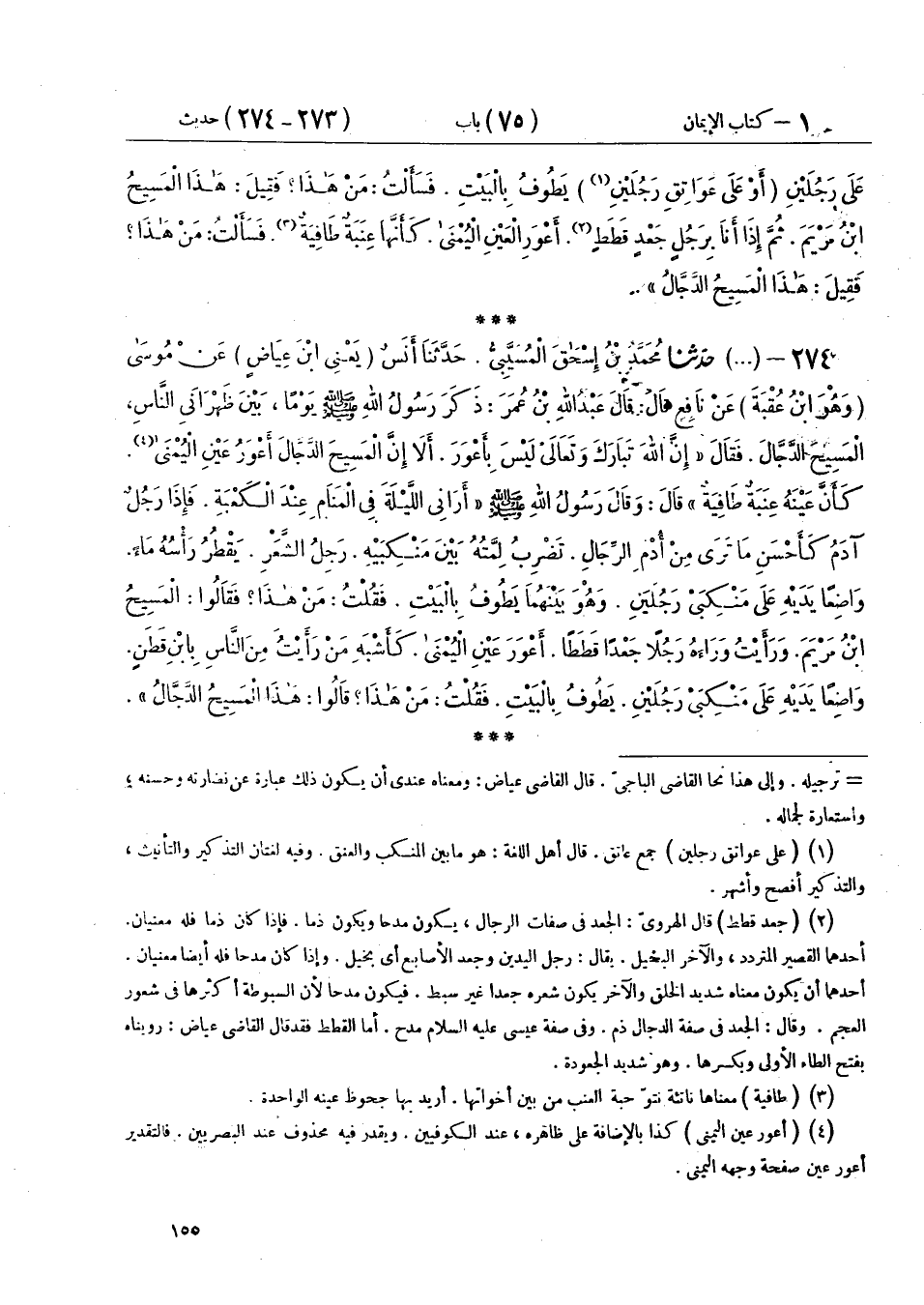 274 - (169) حَدَّثَنَا مُحَمَّدُ بْنُ إِسْحَاقَ الْمُسَيَّبِيُّ، حَدَّثَنَا أَنَسٌ يَعْنِي ابْنَ عِيَاضٍ، عَنْ مُوسَى وَهُوَ ابْنُ عُقْبَةَ، عَنْ نَافِعٍ، قَالَ: قَالَ عَبْدُ اللهِ بْنُ عُمَرَ: ذَكَرَ رَسُولُ اللهِ صَلَّى اللهُ عَلَيْهِ وَسَلَّمَ يَوْمًا بَيْنَ ظَهْرَانَيِ النَّاسِ الْمَسِيحَ الدَّجَّالَ، فَقَالَ: «إِنَّ اللهَ تَبَارَكَ وَتَعَالَى لَيْسَ بِأَعْوَرَ، أَلَا إِنَّ الْمَسِيحَ الدَّجَّالَ أَعْوَرُ، عَيْنِ الْيُمْنَى كَأَنَّ عَيْنَهُ عِنَبَةٌ طَافِيَةٌ»، قَالَ: وَقَالَ رَسُولُ اللهِ صَلَّى اللهُ عَلَيْهِ وَسَلَّمَ: " §أَرَانِي اللَّيْلَةَ فِي الْمَنَامِ عِنْدَ الْكَعْبَةِ، فَإِذَا رَجُلٌ آدَمُ كَأَحْسَنِ مَا تَرَى مِنْ أُدْمِ الرِّجَالِ، تَضْرِبُ لِمَّتُهُ بَيْنَ مَنْكِبَيْهِ، رَجِلُ الشَّعْرِ يَقْطُرُ رَأْسُهُ مَاءً، وَاضِعًا يَدَيْهِ عَلَى مَنْكِبَيْ رَجُلَيْنِ، وَهُوَ بَيْنَهُمَا يَطُوفُ بِالْبَيْتِ، فَقُلْتُ: مَنْ هَذَا؟ فَقَالُوا الْمَسِيحُ ابْنُ مَرْيَمَ، وَرَأَيْتُ وَرَاءَهُ رَجُلًا جَعْدًا قَطَطًا، أَعْوَرَ عَيْنِ الْيُمْنَى كَأَشْبَهِ مَنْ رَأَيْتُ مِنَ النَّاسِ بِابْنِ قَطَنٍ، وَاضِعًا يَدَيْهِ عَلَى مَنْكِبَيْ رَجُلَيْنِ يَطُوفُ بِالْبَيْتِ، فَقُلْتُ: مَنْ هَذَا؟ قَالُوا: هَذَا الْمَسِيحُ الدَّجَّالُ "