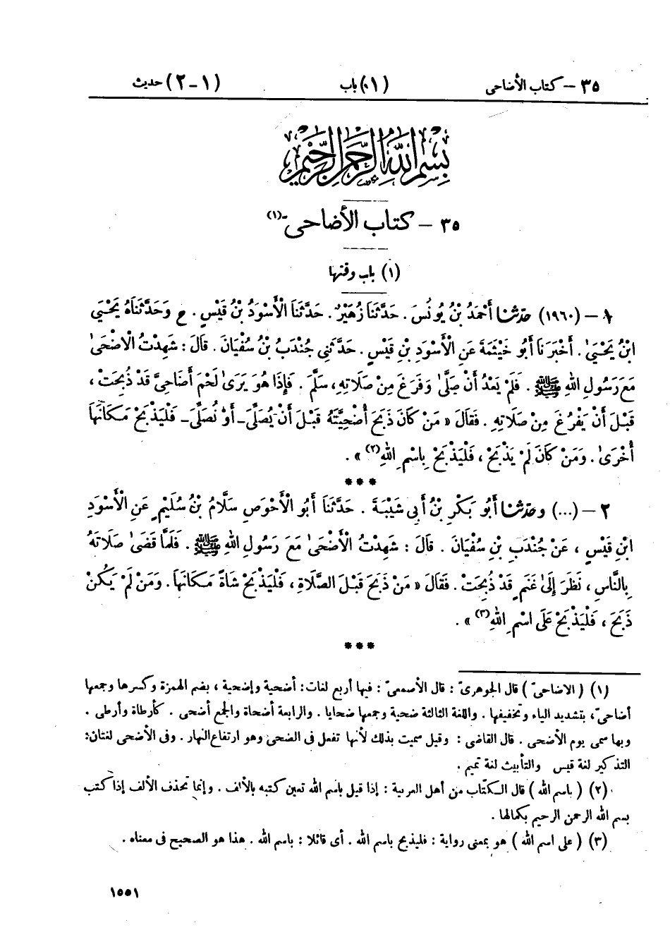 1 - (1960) حَدَّثَنَا أَحْمَدُ بْنُ يُونُسَ، حَدَّثَنَا زُهَيْرٌ، حَدَّثَنَا الْأَسْوَدُ بْنُ قَيْسٍ، ح وَحَدَّثَنَاهُ يَحْيَى بْنُ يَحْيَى، أَخْبَرَنَا أَبُو خَيْثَمَةَ، عَنِ الْأَسْوَدِ بْنِ قَيْسٍ، حَدَّثَنِي جُنْدَبُ بْنُ سُفْيَانَ، قَالَ: شَهِدْتُ الْأَضْحَى مَعَ رَسُولِ اللهِ صَلَّى اللهُ عَلَيْهِ وَسَلَّمَ، فَلَمْ يَعْدُ أَنْ صَلَّى وَفَرَغَ مِنْ صَلَاتِهِ سَلَّمَ، فَإِذَا هُوَ يَرَى لَحْمَ أَضَاحِيَّ قَدْ ذُبِحَتْ قَبْلَ أَنْ يَفْرُغَ مِنْ صَلَاتِهِ، فَقَالَ: «§مَنْ كَانَ ذَبَحَ أُضْحِيَّتَهُ قَبْلَ أَنْ يُصَلِّيَ - أَوْ نُصَلِّيَ -، فَلْيَذْبَحْ مَكَانَهَا أُخْرَى، وَمَنْ كَانَ لَمْ يَذْبَحْ، فَلْيَذْبَحْ بِاسْمِ اللهِ»