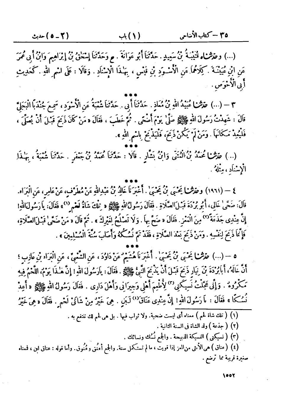 5 - (1961) حَدَّثَنَا يَحْيَى بْنُ يَحْيَى، أَخْبَرَنَا هُشَيْمٌ، عَنْ دَاوُدَ، عَنِ الشَّعْبِيِّ، عَنِ الْبَرَاءِ بْنِ عَازِبٍ، أَنَّ خَالَهُ أَبَا بُرْدَةَ بْنَ نِيَارٍ، ذَبَحَ قَبْلَ أَنْ يَذْبَحَ النَّبِيُّ صَلَّى اللهُ عَلَيْهِ وَسَلَّمَ، فَقَالَ: يَا رَسُولَ اللهِ، إِنَّ هَذَا يَوْمٌ اللَّحْمُ فِيهِ مَكْرُوهٌ، وَإِنِّي عَجَّلْتُ نَسِيكَتِي لِأُطْعِمَ أَهْلِي وَجِيرَانِي وَأَهْلَ دَارِي، فَقَالَ رَسُولُ اللهِ صَلَّى اللهُ عَلَيْهِ وَسَلَّمَ: «§أَعِدْ نُسُكًا»، فَقَالَ: يَا رَسُولَ اللهِ، إِنَّ عِنْدِي عَنَاقَ لَبَنٍ هِيَ خَيْرٌ مِنْ شَاتَيْ لَحْمٍ، فَقَالَ: «هِيَ خَيْرُ نَسِيكَتَيْكَ، وَلَا تَجْزِي جَذَعَةٌ عَنْ أَحَدٍ بَعْدَكَ»