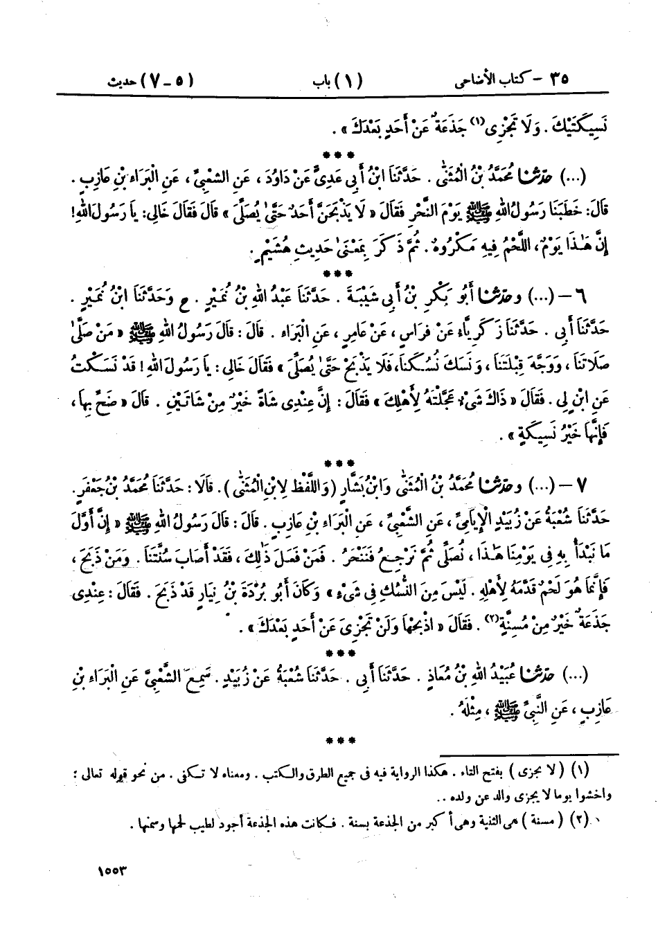 7 - (1961) وحَدَّثَنَا مُحَمَّدُ بْنُ الْمُثَنَّى، وَابْنُ بَشَّارٍ، وَاللَّفْظُ لِابْنِ الْمُثَنَّى، قَالَا: حَدَّثَنَا مُحَمَّدُ بْنُ جَعْفَرٍ، حَدَّثَنَا شُعْبَةُ، عَنْ زُبَيْدٍ الْإِيَامِيِّ، عَنِ الشَّعْبِيِّ، عَنِ الْبَرَاءِ بْنِ عَازِبٍ، قَالَ: قَالَ رَسُولُ اللهِ صَلَّى اللهُ عَلَيْهِ وَسَلَّمَ: «إِنَّ §أَوَّلَ مَا نَبْدَأُ بِهِ فِي يَوْمِنَا هَذَا نُصَلِّي، ثُمَّ نَرْجِعُ فَنَنْحَرُ، فَمَنْ فَعَلَ ذَلِكَ، فَقَدْ أَصَابَ سُنَّتَنَا، وَمَنْ ذَبَحَ، فَإِنَّمَا هُوَ لَحْمٌ قَدَّمَهُ لِأَهْلِهِ لَيْسَ مِنَ النُّسُكِ فِي شَيْءٍ»، وَكَانَ أَبُو بُرْدَةَ بْنُ نِيَارٍ قَدْ ذَبَحَ، فَقَالَ: عِنْدِي جَذَعَةٌ خَيْرٌ مِنْ مُسِنَّةٍ، فَقَالَ: «اذْبَحْهَا وَلَنْ تَجْزِيَ عَنْ أَحَدٍ بَعْدَكَ»،