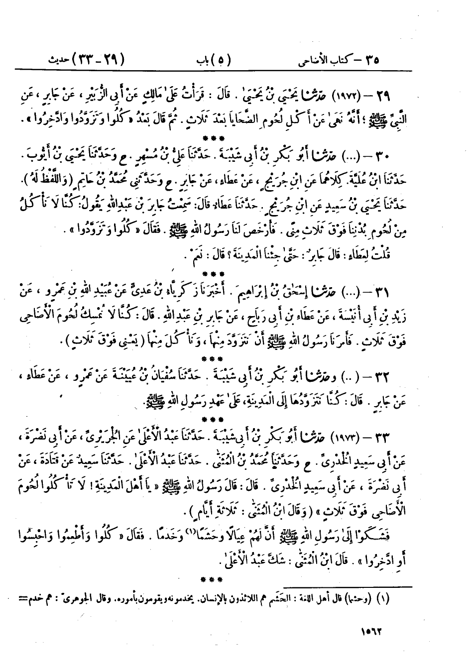 33 - (1973) حَدَّثَنَا أَبُو بَكْرِ بْنُ أَبِي شَيْبَةَ، حَدَّثَنَا عَبْدُ الْأَعْلَى، عَنِ الْجُرَيْرِيِّ، عَنْ أَبِي نَضْرَةَ، عَنْ أَبِي سَعِيدٍ الْخُدْرِيِّ، ح وحَدَّثَنَا مُحَمَّدُ بْنُ الْمُثَنَّى، حَدَّثَنَا عَبْدُ الْأَعْلَى، حَدَّثَنَا سَعِيدٌ، عَنْ قَتَادَةَ، عَنْ أَبِي نَضْرَةَ، عَنْ أَبِي سَعِيدٍ الْخُدْرِيِّ، قَالَ: قَالَ رَسُولُ اللهِ صَلَّى اللهُ عَلَيْهِ وَسَلَّمَ: «يَا أَهْلَ الْمَدِينَةِ، §لَا تَأْكُلُوا لُحُومَ الْأَضَاحِيِّ فَوْقَ ثَلَاثٍ» - وقَالَ ابْنُ الْمُثَنَّى: ثَلَاثَةِ أَيَّامٍ -، فَشَكَوْا إِلَى رَسُولِ اللهِ صَلَّى اللهُ عَلَيْهِ وَسَلَّمَ أَنَّ لَهُمْ عِيَالًا، وَحَشَمًا، وَخَدَمًا، فَقَالَ: «كُلُوا، وَأَطْعِمُوا، وَاحْبِسُوا»، أَوْ «ادَّخِرُوا»، قَالَ ابْنُ الْمُثَنَّى: شَكَّ عَبْدُ الْأَعْلَى