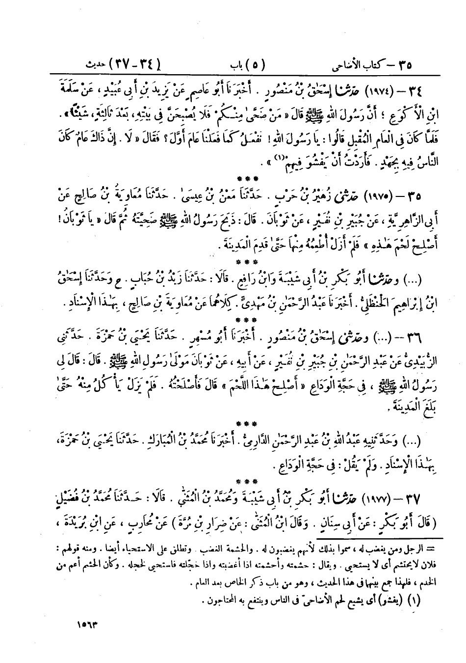34 - (1974) حَدَّثَنَا إِسْحَاقُ بْنُ مَنْصُورٍ، أَخْبَرَنَا أَبُو عَاصِمٍ، عَنْ يَزِيدَ بْنِ أَبِي عُبَيْدٍ، عَنْ سَلَمَةَ بْنِ الْأَكْوَعِ، أَنَّ رَسُولَ اللهِ صَلَّى اللهُ عَلَيْهِ وَسَلَّمَ قَالَ: «§مَنْ ضَحَّى مِنْكُمْ فَلَا يُصْبِحَنَّ فِي بَيْتِهِ بَعْدَ ثَالِثَةٍ شَيْئًا»، فَلَمَّا كَانَ فِي الْعَامِ الْمُقْبِلِ، قَالُوا: يَا رَسُولَ اللهِ، نَفْعَلُ كَمَا فَعَلْنَا عَامَ أَوَّلَ، فَقَالَ: «لَا، إِنَّ ذَاكَ عَامٌ كَانَ النَّاسُ فِيهِ بِجَهْدٍ، فَأَرَدْتُ أَنْ يَفْشُوَ فِيهِمْ»
