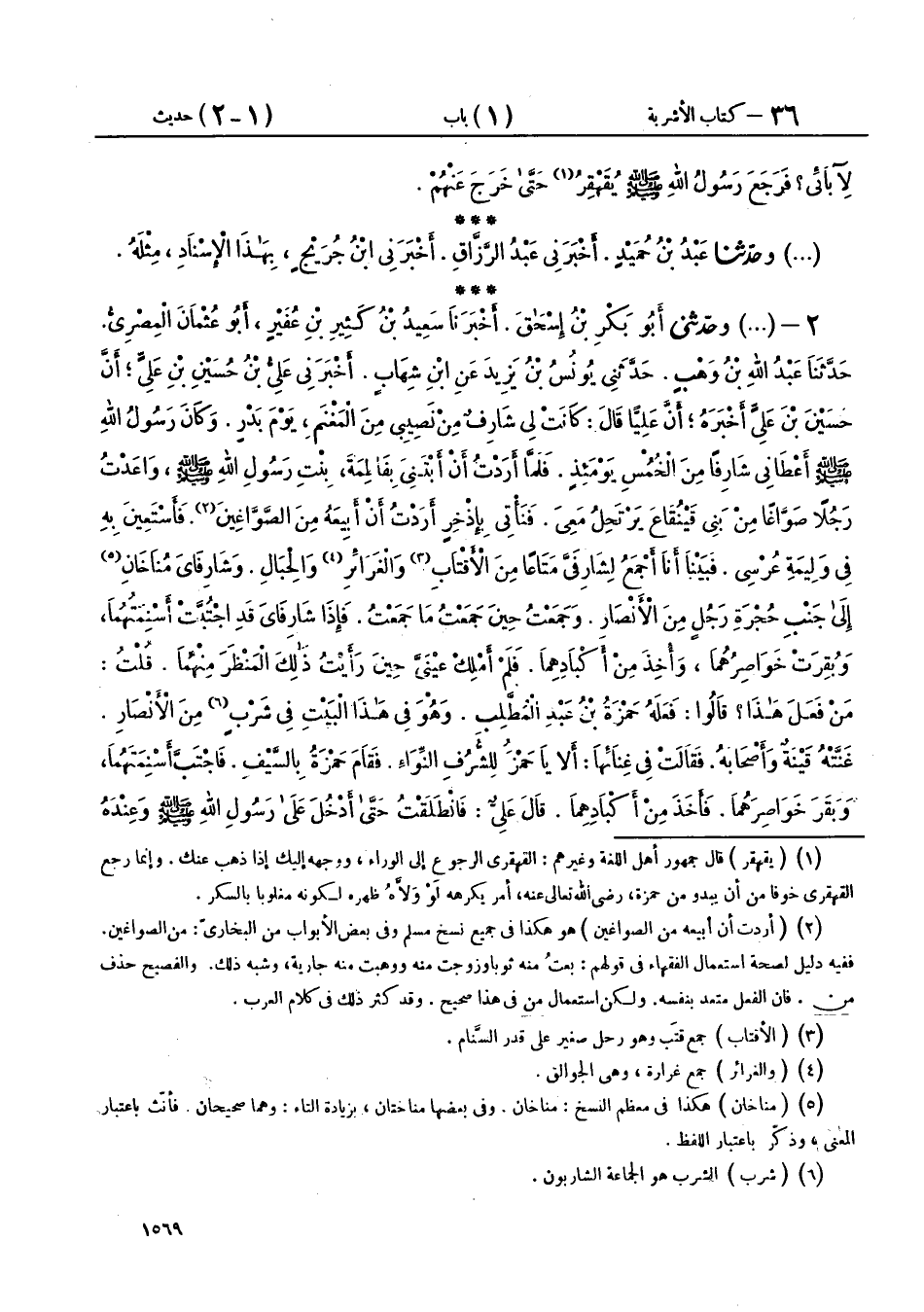 2 - (1979) وحَدَّثَنِي أَبُو بَكْرِ بْنُ إِسْحَاقَ، أَخْبَرَنَا سَعِيدُ بْنُ كَثِيرِ بْنِ عُفَيْرٍ أَبُو عُثْمَانَ الْمِصْرِيُّ، حَدَّثَنَا عَبْدُ اللهِ بْنُ وَهْبٍ، حَدَّثَنِي يُونُسُ بْنُ يَزِيدَ، عَنِ ابْنِ شِهَابٍ، أَخْبَرَنِي عَلِيُّ بْنُ حُسَيْنِ بْنِ عَلِيٍّ، أَنَّ حُسَيْنَ بْنَ عَلِيٍّ، أَخْبَرَهُ، أَنَّ عَلِيًّا، قَالَ: كَانَتْ لِي شَارِفٌ مِنْ نَصِيبِي مِنَ الْمَغْنَمِ يَوْمَ بَدْرٍ، وَكَانَ رَسُولُ اللهِ صَلَّى اللهُ عَلَيْهِ وَسَلَّمَ أَعْطَانِي شَارِفًا مِنَ الْخُمُسِ يَوْمَئِذٍ، فَلَمَّا أَرَدْتُ أَنْ أَبْتَنِيَ بِفَاطِمَةَ بِنْتِ رَسُولِ اللهِ صَلَّى اللهُ عَلَيْهِ وَسَلَّمَ، وَاعَدْتُ رَجُلًا صَوَّاغًا مِنْ بَنِي قَيْنُقَاعَ يَرْتَحِلُ مَعِيَ، فَنَأْتِي بِإِذْخِرٍ أَرَدْتُ أَنْ أَبِيعَهُ مِنَ الصَّوَّاغِينَ فَأَسْتَعِينَ بِهِ فِي وَلِيمَةِ عُرْسِي، فَبَيْنَا أَنَا أَجْمَعُ لِشَارِفَيَّ مَتَاعًا مِنَ الْأَقْتَابِ، وَالْغَرَائِرِ وَالْحِبَالِ، وَشَارِفَايَ مُنَاخَتَانِ إِلَى جَنْبِ حُجْرَةِ رَجُلٍ مِنَ الْأَنْصَارِ، وَجَمَعْتُ حِينَ جَمَعْتُ مَا جَمَعْتُ، فَإِذَا شَارِفَايَ قَدِ اجْتُبَّتْ أَسْنِمَتُهُمَا، وَبُقِرَتْ خَوَاصِرُهُمَا، وَأُخِذَ مِنْ أَكْبَادِهِمَا، فَلَمْ أَمْلِكْ عَيْنَيَّ حِينَ رَأَيْتُ ذَلِكَ الْمَنْظَرَ مِنْهُمَا، قُلْتُ: مَنْ فَعَلَ هَذَا؟ قَالُوا: فَعَلَهُ حَمْزَةُ بْنُ عَبْدِ الْمُطَّلِبِ وَهُوَ فِي هَذَا الْبَيْتِ فِي شَرْبٍ مِنَ الْأَنْصَارِ غَنَّتْهُ قَيْنَةٌ وَأَصْحَابَهُ، فَقَالَتْ فِي غِنَائِهَا: