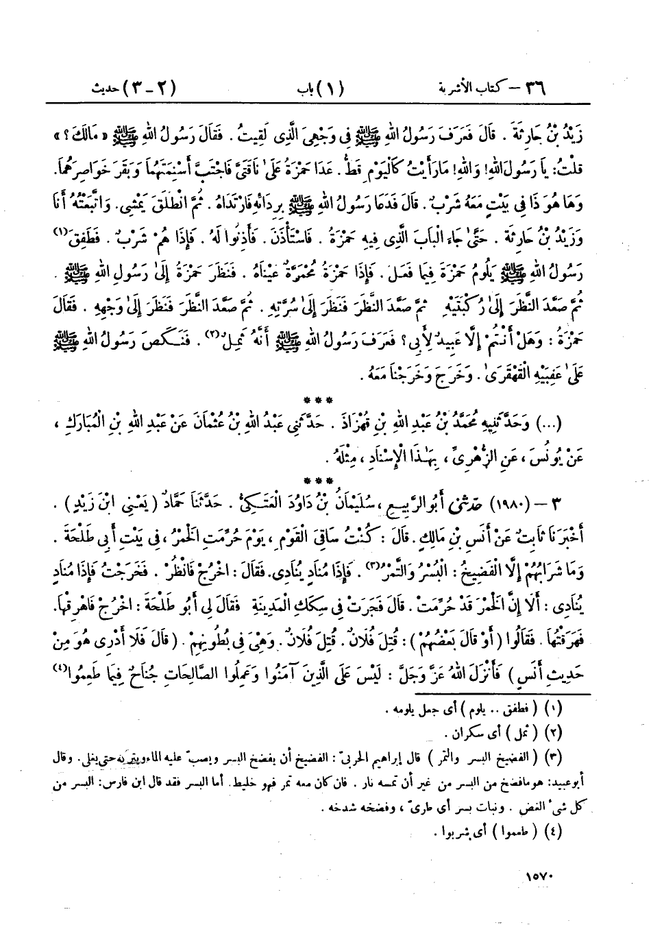 3 - (1980) حَدَّثَنِي أَبُو الرَّبِيعِ سُلَيْمَانُ بْنُ دَاوُدَ الْعَتَكِيُّ، حَدَّثَنَا حَمَّادٌ يَعْنِي ابْنَ زَيْدٍ، أَخْبَرَنَا ثَابِتٌ، عَنْ أَنَسِ بْنِ مَالِكٍ، قَالَ: كُنْتُ سَاقِيَ الْقَوْمِ يَوْمَ حُرِّمَتِ الْخَمْرُ فِي بَيْتِ أَبِي طَلْحَةَ، وَمَا شَرَابُهُمْ إِلَّا الْفَضِيخُ: الْبُسْرُ وَالتَّمْرُ، فَإِذَا مُنَادٍ يُنَادِي، فَقَالَ: اخْرُجْ فَانْظُرْ، فَخَرَجْتُ، فَإِذَا مُنَادٍ يُنَادِي: «§أَلَا إِنَّ الْخَمْرَ قَدْ حُرِّمَتْ»، قَالَ: فَجَرَتْ فِي سِكَكِ الْمَدِينَةِ، فَقَالَ لِي أَبُو طَلْحَةَ: اخْرُجْ فَاهْرِقْهَا، فَهَرَقْتُهَا، فَقَالُوا - أَوْ قَالَ بَعْضُهُمْ: - قُتِلَ فُلَانٌ، قُتِلَ فُلَانٌ، وَهِيَ فِي بُطُونِهِمْ، - قَالَ: فَلَا أَدْرِي هُوَ مِنْ حَدِيثِ أَنَسٍ -، فَأَنْزَلَ اللهُ عَزَّ وَجَلَّ: {لَيْسَ عَلَى الَّذِينَ آمَنُوا وَعَمِلُوا الصَّالِحَاتِ جُنَاحٌ فِيمَا طَعِمُوا إِذَا مَا اتَّقَوْا وَآمَنُوا وَعَمِلُوا الصَّالِحَاتِ} [المائدة: 93]