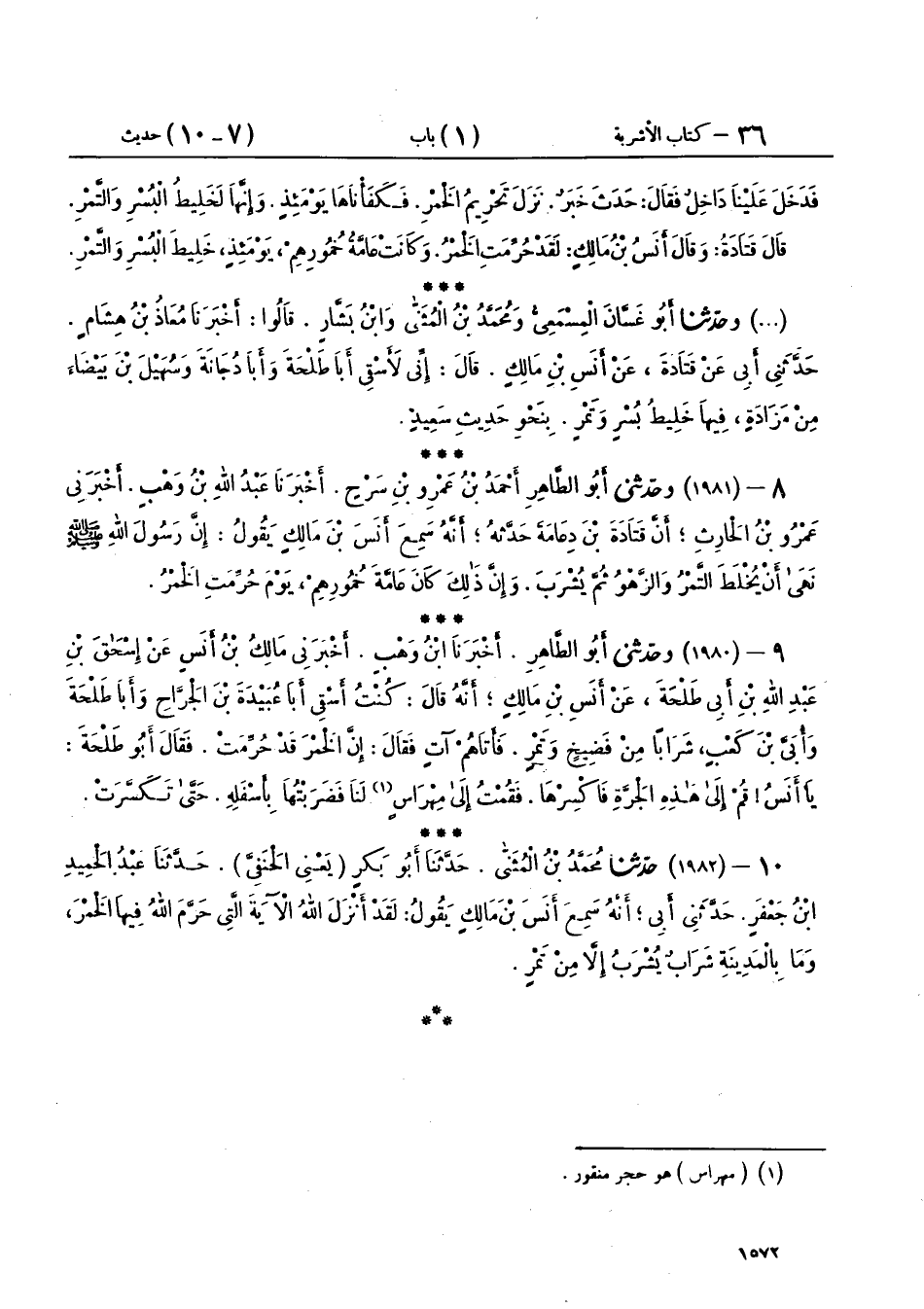 9 - (1980) وحَدَّثَنِي أَبُو الطَّاهِرِ، أَخْبَرَنَا ابْنُ وَهْبٍ، أَخْبَرَنِي مَالِكُ بْنُ أَنَسٍ، عَنْ إِسْحَاقَ بْنِ عَبْدِ اللهِ بْنِ أَبِي طَلْحَةَ، عَنْ أَنَسِ بْنِ مَالِكٍ، أَنَّهُ، قَالَ: كُنْتُ أَسْقِي أَبَا عُبَيْدَةَ بْنَ الْجَرَّاحِ، وَأَبَا طَلْحَةَ، وَأُبَيَّ بْنَ كَعْبٍ شَرَابًا مِنْ فَضِيخٍ وَتَمْرٍ، فَأَتَاهُمْ آتٍ، فَقَالَ: «إِنَّ §الْخَمْرَ قَدْ حُرِّمَتْ»، فَقَالَ أَبُو طَلْحَةَ: يَا أَنَسُ، قُمْ إِلَى هَذِهِ الْجَرَّةِ فَاكْسِرْهَا، فَقُمْتُ إِلَى مِهْرَاسٍ لَنَا فَضَرَبْتُهَا بِأَسْفَلِهِ حَتَّى تَكَسَّرَتْ