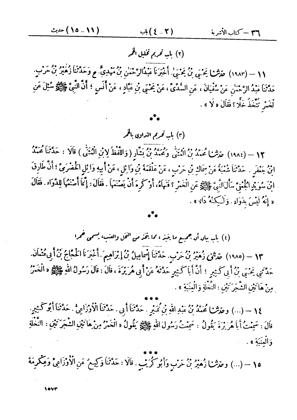 11 - (1983) حَدَّثَنَا يَحْيَى بْنُ يَحْيَى، أَخْبَرَنَا عَبْدُ الرَّحْمَنِ بْنُ مَهْدِيٍّ، ح وحَدَّثَنَا زُهَيْرُ بْنُ حَرْبٍ، حَدَّثَنَا عَبْدُ الرَّحْمَنِ، عَنْ سُفْيَانَ، عَنِ السُّدِّيِّ، عَنْ يَحْيَى بْنِ عَبَّادٍ، عَنْ أَنَسٍ، أَنَّ النَّبِيَّ صَلَّى اللهُ عَلَيْهِ وَسَلَّمَ §سُئِلَ عَنِ الْخَمْرِ تُتَّخَذُ خَلًّا، فَقَالَ: «لَا»