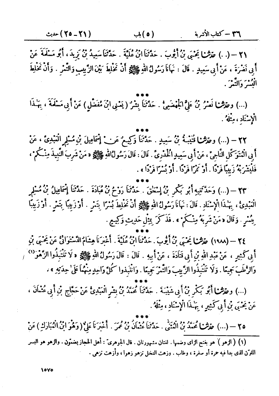 25 - (1988) حَدَّثَنَا مُحَمَّدُ بْنُ الْمُثَنَّى، حَدَّثَنَا عُثْمَانُ بْنُ عُمَرَ، أَخْبَرَنَا عَلِيٌّ وَهُوَ ابْنُ الْمُبَارَكِ، عَنْ يَحْيَى، عَنْ أَبِي سَلَمَةَ، عَنْ أِبِي قَتَادَةَ، أَنَّ رَسُولَ اللهِ صَلَّى اللهُ عَلَيْهِ وَسَلَّمَ قَالَ: «§لَا تَنْتَبِذُوا الزَّهْوَ وَالرُّطَبَ جَمِيعًا، وَلَا تَنْتَبِذُوا الرُّطَبَ وَالزَّبِيبَ جَمِيعًا، وَلَكِنِ انْتَبِذُوا كُلَّ وَاحِدٍ عَلَى حِدَتِهِ»، وَزَعَمَ يَحْيَى، أَنَّهُ لَقِيَ عَبْدَ اللهِ بْنَ أَبِي قَتَادَةَ، فَحَدَّثَهُ عَنْ أَبِيهِ، عَنِ النَّبِيِّ صَلَّى اللهُ عَلَيْهِ وَسَلَّمَ بِمِثْلِ هَذَا،