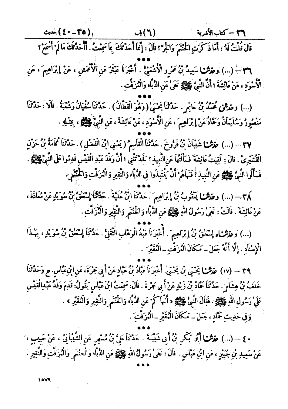 37 - (1995) حَدَّثَنَا شَيْبَانُ بْنُ فَرُّوخَ، حَدَّثَنَا الْقَاسِمُ يَعْنِي ابْنَ الْفَضْلِ، حَدَّثَنَا ثُمَامَةُ بْنُ حَزْنٍ الْقُشَيْرِيُّ، قَالَ: لَقِيتُ عَائِشَةَ، فَسَأَلْتُهَا عَنِ النَّبِيذِ، فَحَدَّثَتْنِي أَنَّ وَفْدَ عَبْدِ الْقَيْسِ قَدِمُوا عَلَى النَّبِيِّ صَلَّى اللهُ عَلَيْهِ وَسَلَّمَ، فَسَأَلُوا النَّبِيَّ صَلَّى اللهُ عَلَيْهِ وَسَلَّمَ عَنِ النَّبِيذِ، «§فَنَهَاهُمْ أَنْ يَنْتَبِذُوا فِي الدُّبَّاءِ وَالنَّقِيرِ وَالْمُزَفَّتِ وَالْحَنْتَمِ»