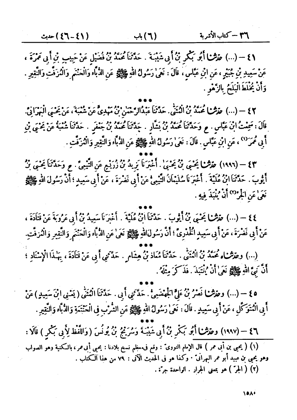 44 - (1996) حَدَّثَنَا يَحْيَى بْنُ أَيُّوبَ، حَدَّثَنَا ابْنُ عُلَيَّةَ، أَخْبَرَنَا سَعِيدُ بْنُ أَبِي عَرُوبَةَ، عَنْ قَتَادَةَ، عَنْ أَبِي نَضْرَةَ، عَنْ أَبِي سَعِيدٍ الْخُدْرِيِّ، «أَنَّ رَسُولَ اللهِ صَلَّى اللهُ عَلَيْهِ وَسَلَّمَ §نَهَى عَنِ الدُّبَّاءِ وَالْحَنْتَمِ وَالنَّقِيرِ وَالْمُزَفَّتِ»،