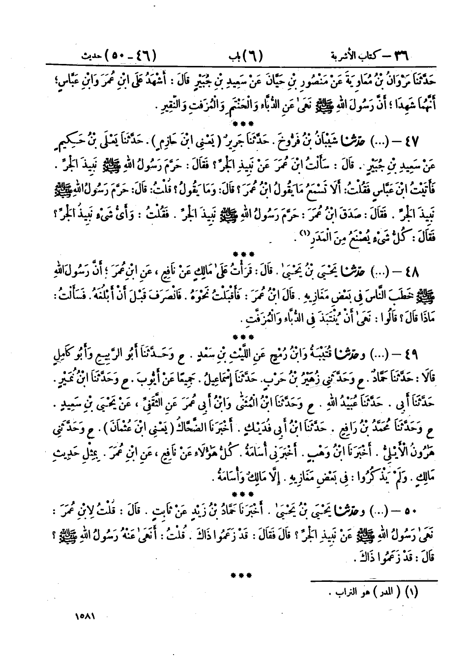 48 - (1997) حَدَّثَنَا يَحْيَى بْنُ يَحْيَى، قَالَ: قَرَأْتُ عَلَى مَالِكٍ، عَنْ نَافِعٍ، عَنِ ابْنِ عُمَرَ، أَنَّ رَسُولَ اللهِ صَلَّى اللهُ عَلَيْهِ وَسَلَّمَ خَطَبَ النَّاسَ فِي بَعْضِ مَغَازِيهِ، قَالَ ابْنُ عُمَرَ: فَأَقْبَلْتُ نَحْوَهُ، فَانْصَرَفَ قَبْلَ أَنْ أَبْلُغَهُ، فَسَأَلْتُ مَاذَا، قَالَ: قَالُوا: «§نَهَى أَنْ يُنْتَبَذَ فِي الدُّبَّاءِ وَالْمُزَفَّتِ»،
