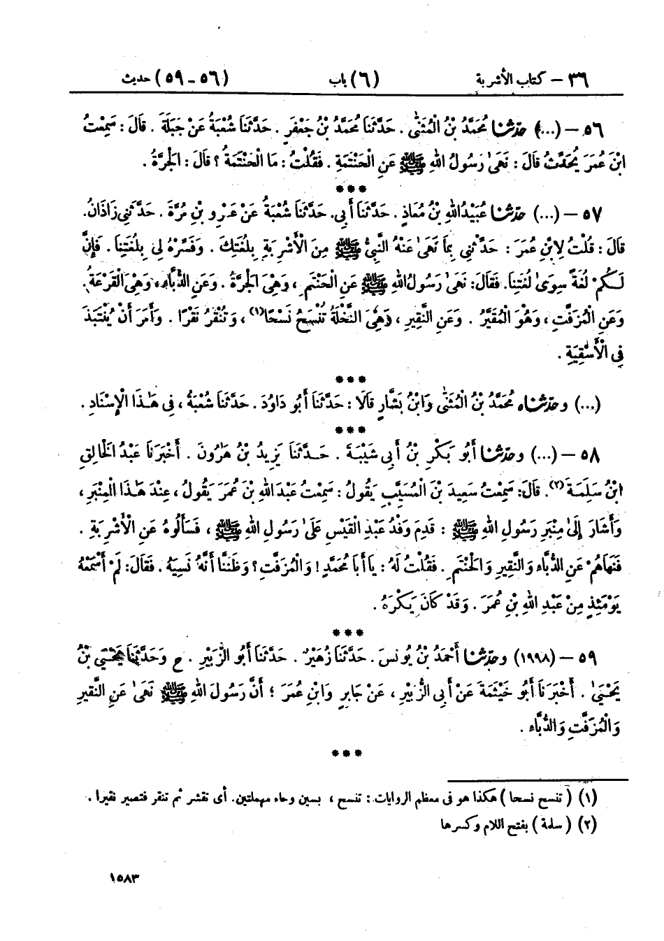 57 - (1997) حَدَّثَنَا عُبَيْدُ اللهِ بْنُ مُعَاذٍ، حَدَّثَنَا أَبِي، حَدَّثَنَا شُعْبَةُ، عَنْ عَمْرِو بْنِ مُرَّةَ، حَدَّثَنِي زَاذَانُ، قَالَ: قُلْتُ لِابْنِ عُمَرَ: حَدِّثْنِي بِمَا نَهَى عَنْهُ النَّبِيُّ صَلَّى اللهُ عَلَيْهِ وَسَلَّمَ مِنَ الْأَشْرِبَةِ بِلُغَتِكَ، وَفَسِّرْهُ لِي بِلُغَتِنَا، فَإِنَّ لَكُمْ لُغَةً سِوَى لُغَتِنَا، فَقَالَ: «§نَهَى رَسُولُ اللهِ صَلَّى اللهُ عَلَيْهِ وَسَلَّمَ عَنِ الْحَنْتَمِ، وَهِيَ الْجَرَّةُ، وَعَنِ الدُّبَّاءِ، وَهِيَ الْقَرْعَةُ، وَعَنِ الْمُزَفَّتِ، وَهُوَ الْمُقَيَّرُ، وَعَنِ النَّقِيرِ، وَهِيَ النَّخْلَةُ تُنْسَحُ نَسْحًا، وَتُنْقَرُ نَقْرًا، وَأَمَرَ أَنْ يُنْتَبَذَ فِي الْأَسْقِيَةِ»،