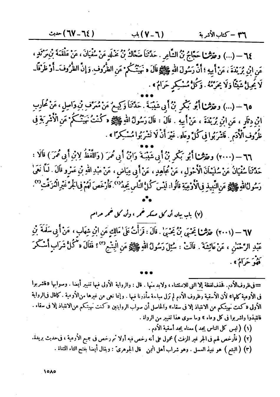 64 - (1999) وحَدَّثَنَا حَجَّاجُ بْنُ الشَّاعِرِ، حَدَّثَنَا ضَحَّاكُ بْنُ مَخْلَدٍ، عَنْ سُفْيَانَ، عَنْ عَلْقَمَةَ بْنِ مَرْثَدٍ، عَنِ ابْنِ بُرَيْدَةَ، عَنْ أَبِيهِ، أَنَّ رَسُولَ اللهِ صَلَّى اللهُ عَلَيْهِ وَسَلَّمَ قَالَ: «§نَهَيْتُكُمْ عَنِ الظُّرُوفِ، وَإِنَّ الظُّرُوفَ - أَوْ ظَرْفًا - لَا يُحِلُّ شَيْئًا وَلَا يُحَرِّمُهُ، وَكُلُّ مُسْكِرٍ حَرَامٌ»