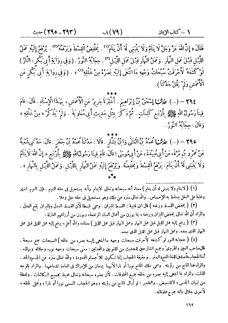 295 - (179) حَدَّثَنَا مُحَمَّدُ بْنُ الْمُثَنَّى، وَابْنُ بَشَّارٍ، قَالَا: حَدَّثَنَا مُحَمَّدُ بْنُ جَعْفَرٍ، قَالَ: حَدَّثَنِي شُعْبَةُ، عَنْ عَمْرِو بْنِ مُرَّةَ، عَنْ أَبِي عُبَيْدَةَ، عَنْ أَبِي مُوسَى، قَالَ: قَامَ فِينَا رَسُولُ اللهِ صَلَّى اللهُ عَلَيْهِ وَسَلَّمَ بِأَرْبَعٍ: «إِنَّ §اللهَ لَا يَنَامُ وَلَا يَنْبَغِي لَهُ أَنْ يَنَامَ، يَرْفَعُ الْقِسْطَ وَيَخْفِضُهُ، وَيُرْفَعُ إِلَيْهِ عَمَلُ النَّهَارِ بِاللَّيْلِ، وَعَمَلُ اللَّيْلِ بِالنَّهَارِ»