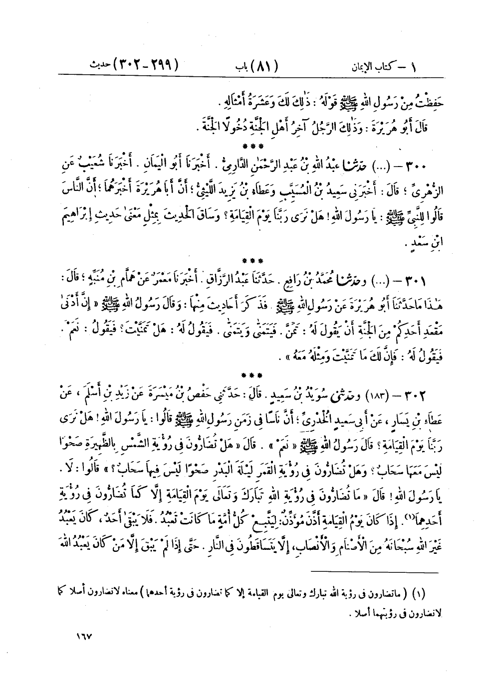 302 - (183) وَحَدَّثَنِي سُوَيْدُ بْنُ سَعِيدٍ، قَالَ: حَدَّثَنِي حَفْصُ بْنُ مَيْسَرَةَ، عَنْ زَيْدِ بْنِ أَسْلَمَ، عَنْ عَطَاءِ بْنِ يَسَارٍ، عَنْ أَبِي سَعِيدٍ الْخُدْرِيِّ، أَنَّ نَاسًا فِي زَمَنِ رَسُولِ اللهِ صَلَّى اللهُ عَلَيْهِ وَسَلَّمَ قَالُوا: يَا رَسُولَ اللهِ، هَلْ نَرَى رَبَّنَا يَوْمَ الْقِيَامَةِ؟ قَالَ رَسُولُ اللهِ صَلَّى اللهُ عَلَيْهِ وَسَلَّمَ: «نَعَمْ» قَالَ: «هَلْ تُضَارُّونَ فِي رُؤْيَةِ الشَّمْسِ بِالظَّهِيرَةِ صَحْوًا لَيْسَ مَعَهَا سَحَابٌ؟ وَهَلْ تُضَارُّونَ فِي رُؤْيَةِ الْقَمَرِ لَيْلَةَ الْبَدْرِ صَحْوًا لَيْسَ فِيهَا سَحَابٌ؟» قَالُوا: لَا يَا رَسُولَ اللهِ، قَالَ: " مَا تُضَارُّونَ فِي رُؤْيَةِ اللهِ تَبَارَكَ وَتَعَالَى يَوْمَ الْقِيَامَةِ إِلَّا كَمَا تُضَارُّونَ فِي رُؤْيَةِ أَحَدِهِمَا، إِذَا كَانَ يَوْمُ الْقِيَامَةِ أَذَّنَ مُؤَذِّنٌ لِيَتَّبِعْ كُلُّ أُمَّةٍ مَا كَانَتْ تَعْبُدُ، فَلَا يَبْقَى أَحَدٌ كَانَ يَعْبُدُ غَيْرَ اللهِ سُبْحَانَهُ مِنَ الْأَصْنَامِ وَالْأَنْصَابِ إِلَّا يَتَسَاقَطُونَ فِي النَّارِ، حَتَّى إِذَا لَمْ يَبْقَ إِلَّا مَنْ كَانَ يَعْبُدُ اللهَ -[168]- مِنْ بَرٍّ وَفَاجِرٍ وَغُبَّرِ أَهْلِ الْكِتَابِ، فَيُدْعَى الْيَهُودُ، فَيُقَالُ لَهُمْ: مَا كُنْتُمْ تَعْبُدُونَ؟ قَالُوا: كُنَّا نَعْبُدُ عُزَيْرَ ابْنَ اللهِ، فَيُقَالُ: كَذَبْتُمْ مَا اتَّخَذَ اللهُ مِنْ صَاحِبَةٍ وَلَا وَلَدٍ، فَمَاذَا تَبْغُونَ؟ قَالُوا: عَطِشْنَا يَا رَبَّنَا، فَاسْقِنَا، فَيُشَارُ إِلَيْهِمْ أَلَا تَرِدُونَ؟ فَيُحْشَرُونَ إِلَى النَّارِ كَأَنَّهَا سَرَابٌ يَحْطِمُ بَعْضُهَا بَعْضًا، فَيَتَسَاقَطُونَ فِي النَّارِ، ثُمَّ يُدْعَى النَّصَارَى، فَيُقَالُ لَهُمْ: مَا كُنْتُمْ تَعْبُدُونَ؟ قَالُوا: كُنَّا نَعْبُدُ الْمَسِيحَ ابْنَ اللهِ، فَيُقَالُ لَهُمْ، كَذَبْتُمْ مَا اتَّخَذَ اللهُ مِنْ صَاحِبَةٍ وَلَا وَلَدٍ، فَيُقَالُ لَهُمْ: مَاذَا تَبْغُونَ؟ فَيَقُولُونَ: عَطِشْنَا يَا رَبَّنَا، فَاسْقِنَا، قَالَ: فَيُشَارُ إِلَيْهِمْ أَلَا تَرِدُونَ؟ فَيُحْشَرُونَ إِلَى جَهَنَّمَ كَأَنَّهَا سَرَابٌ يَحْطِمُ بَعْضُهَا بَعْضًا، فَيَتَسَاقَطُونَ فِي النَّارِ حَتَّى إِذَا لَمْ يَبْقَ إِلَّا مَنْ كَانَ يَعْبُدُ اللهَ تَعَالَى مِنْ بَرٍّ وَفَاجِرٍ أَتَاهُمْ رَبُّ الْعَالَمِينَ سُبْحَانَهُ وَتَعَالَى فِي أَدْنَى صُورَةٍ مِنَ الَّتِي رَأَوْهُ فِيهَا قَالَ: فَمَا تَنْتَظِرُونَ؟ تَتْبَعُ كُلُّ أُمَّةٍ مَا كَانَتْ تَعْبُدُ، قَالُوا: يَا رَبَّنَا، فَارَقْنَا النَّاسَ فِي الدُّنْيَا أَفْقَرَ مَا كُنَّا إِلَيْهِمْ، وَلَمْ نُصَاحِبْهُمْ، فَيَقُولُ: أَنَا رَبُّكُمْ، فَيَقُولُونَ: نَعُوذُ بِاللهِ مِنْكَ لَا نُشْرِكُ بِاللهِ شَيْئًا مَرَّتَيْنِ أَوْ ثَلَاثًا، حَتَّى إِنَّ بَعْضَهُمْ لَيَكَادُ أَنْ يَنْقَلِبَ، فَيَقُولُ: §هَلْ بَيْنَكُمْ وَبَيْنَهُ آيَةٌ فَتَعْرِفُونَهُ بِهَا؟ فَيَقُولُونَ: نَعَمْ، فَيُكْشَفُ عَنْ سَاقٍ فَلَا يَبْقَى مَنْ كَانَ يَسْجُدُ لِلَّهِ مِنْ تِلْقَاءِ نَفْسِهِ إِلَّا أَذِنَ اللهُ لَهُ بِالسُّجُودِ، وَلَا يَبْقَى مَنْ كَانَ يَسْجُدُ اتِّقَاءً وَرِيَاءً إِلَّا جَعَلَ اللهُ -[169]- ظَهْرَهُ طَبَقَةً وَاحِدَةً، كُلَّمَا أَرَادَ أَنْ يَسْجُدَ خَرَّ عَلَى قَفَاهُ، ثُمَّ يَرْفَعُونَ رُءُوسَهُمْ وَقَدْ تَحَوَّلَ فِي صُورَتِهِ الَّتِي رَأَوْهُ فِيهَا أَوَّلَ مَرَّةٍ، فَقَالَ: أَنَا رَبُّكُمْ، فَيَقُولُونَ: أَنْتَ رَبُّنَا، ثُمَّ يُضْرَبُ الْجِسْرُ عَلَى جَهَنَّمَ، وَتَحِلُّ الشَّفَاعَةُ، وَيَقُولُونَ: اللهُمَّ سَلِّمْ، سَلِّمْ " قِيلَ: يَا رَسُولَ اللهِ، وَمَا الْجِسْرُ؟ قَالَ: " دَحْضٌ مَزِلَّةٌ، فِيهِ خَطَاطِيفُ وَكَلَالِيبُ وَحَسَكٌ تَكُونُ بِنَ