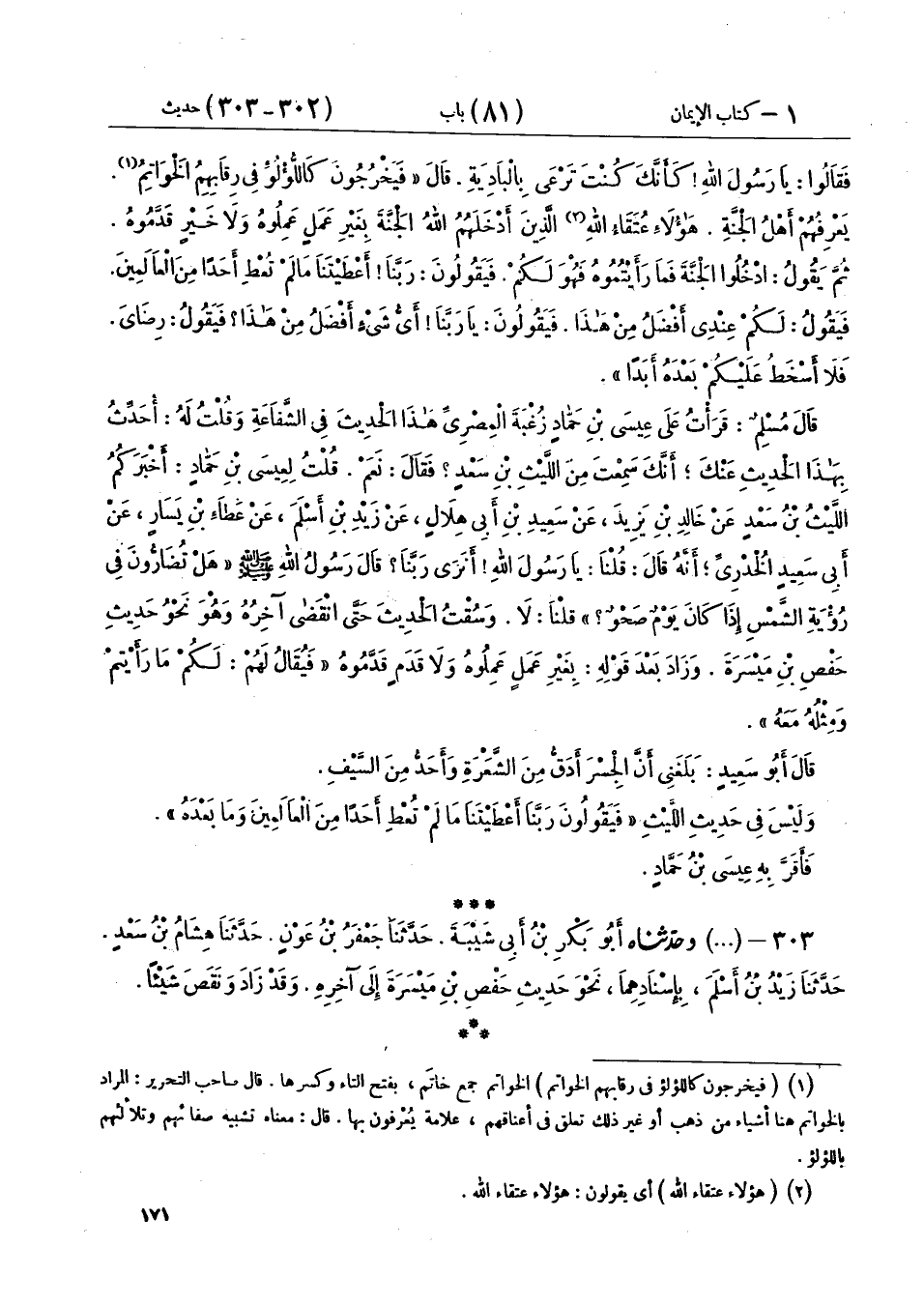 303 - (183) وَحَدَّثَنَاهُ أَبُو بَكْرِ بْنُ أَبِي شَيْبَةَ، حَدَّثَنَا جَعْفَرُ بْنُ عَوْنٍ، حَدَّثَنَا هِشَامُ بْنُ سَعْدٍ، حَدَّثَنَا زَيْدُ بْنُ أَسْلَمَ بِإِسْنَادِهِمَا نَحْوَ حَدِيثِ حَفْصِ بْنِ مَيْسَرَةَ إِلَى آخِرِهِ، وَقَدْ زَادَ وَنَقَصَ شَيْئًا