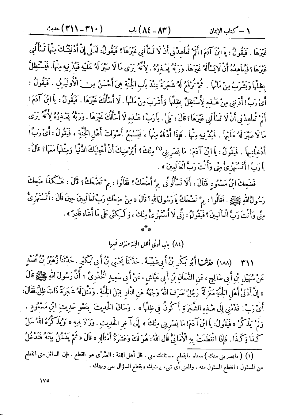 311 - (188) حَدَّثَنَا أَبُو بَكْرِ بْنُ أَبِي شَيْبَةَ، حَدَّثَنَا يَحْيَى بْنُ أَبِي بُكَيْرٍ، حَدَّثَنَا زُهَيْرُ بْنُ مُحَمَّدٍ، عَنْ سُهَيْلِ بْنِ أَبِي صَالِحٍ، عَنِ النُّعْمَانِ بْنِ أَبِي عَيَّاشٍ، عَنْ أَبِي سَعِيدٍ الْخُدْرِيِّ، أَنَّ رَسُولَ اللهِ صَلَّى اللهُ عَلَيْهِ وَسَلَّمَ قَالَ: " إِنَّ أَدْنَى أَهْلِ الْجَنَّةِ مَنْزِلَةً، رَجُلٌ صَرَفَ اللهُ وَجْهَهُ عَنِ النَّارِ قِبَلَ الْجَنَّةِ، وَمَثَّلَ لَهُ شَجَرَةً ذَاتَ ظِلٍّ، فَقَالَ: أَيْ رَبِّ، قَدِّمْنِي إِلَى هَذِهِ الشَّجَرَةِ أَكُونُ فِي ظِلِّهَا " وَسَاقَ الْحَدِيثَ بِنَحْوِ حَدِيثِ ابْنِ مَسْعُودٍ، وَلَمْ يَذْكُرْ: فَيَقُولُ: «يَا ابْنَ آدَمَ مَا يَصْرِينِي مِنْكَ؟» إِلَى آخِرِ الْحَدِيثِ، وَزَادَ فِيهِ: " وَيُذَكِّرُهُ اللهُ، سَلْ كَذَا وَكَذَا، فَإِذَا انْقَطَعَتْ بِهِ الْأَمَانِيُّ، قَالَ اللهُ: §هُوَ لَكَ وَعَشَرَةُ أَمْثَالِهِ "، قَالَ: " ثُمَّ يَدْخُلُ بَيْتَهُ، فَتَدْخُلُ عَلَيْهِ زَوْجَتَاهُ مِنَ الْحُورِ الْعِينِ، فَتَقُولَانِ: الْحَمْدُ لِلَّهِ الَّذِي أَحْيَاكَ لَنَا، وَأَحْيَانَا لَكَ "، قَالَ: " فَيَقُولُ: مَا أُعْطِيَ أَحَدٌ مِثْلَ مَا أُعْطِيتُ "