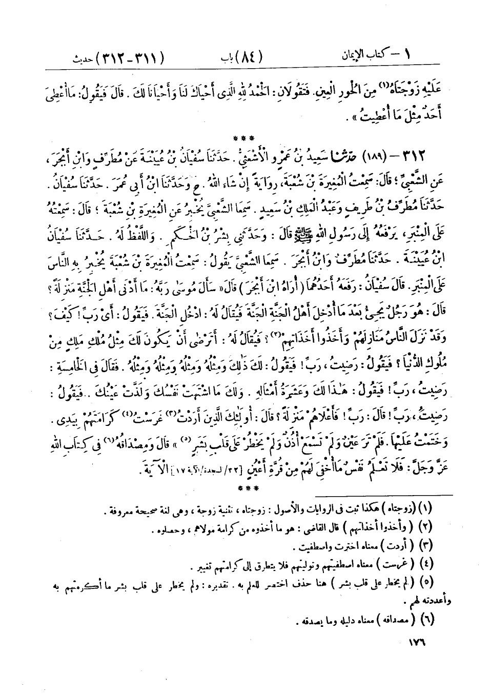 312 - (189) حَدَّثَنَا سَعِيدُ بْنُ عَمْرٍو الْأَشْعَثِيُّ، حَدَّثَنَا سُفْيَانُ بْنُ عُيَيْنَةَ، عَنْ مُطَرِّفٍ، وَابْنِ أَبْجَرَ، عَنِ الشَّعْبِيِّ قَالَ: سَمِعْتُ الْمُغِيرَةَ بْنَ شُعْبَةَ رِوَايَةً - إِنْ شَاءَ اللهُ - ح، وَحَدَّثَنَا ابْنُ أَبِي عُمَرَ، حَدَّثَنَا سُفْيَانُ، حَدَّثَنَا مُطَرِّفُ بْنُ طَرِيفٍ، وَعَبْدُ الْمَلِكِ بْنُ سَعِيدٍ، سَمِعَا الشَّعْبِيَّ، يُخْبِرُ عَنِ الْمُغِيرَةِ بْنِ شُعْبَةَ، قَالَ: سَمِعْتُهُ عَلَى الْمِنْبَرِ يَرْفَعُهُ إِلَى رَسُولِ اللهِ صَلَّى اللهُ عَلَيْهِ وَسَلَّمَ قَالَ: وَحَدَّثَنِي بِشْرُ بْنُ الْحَكَمِ - وَاللَّفْظُ لَهُ - حَدَّثَنَا سُفْيَانُ بْنُ عُيَيْنَةَ، حَدَّثَنَا مُطَرِّفٌ، وَابْنُ أَبْجَرَ سَمِعَا الشَّعْبِيَّ، يَقُولُ: سَمِعْتُ الْمُغِيرَةَ بْنَ شُعْبَةَ، يُخْبِرُ بِهِ النَّاسَ عَلَى الْمِنْبَرِ - قَالَ سُفْيَانُ: رَفَعَهُ أَحَدُهُمَا، أُرَاهُ ابْنَ أَبْجَرَ - قَالَ: " سَأَلَ مُوسَى رَبَّهُ، مَا أَدْنَى أَهْلِ الْجَنَّةِ مَنْزِلَةً، قَالَ: هُوَ رَجُلٌ يَجِيءُ بَعْدَ مَا أُدْخِلَ أَهْلُ الْجَنَّةِ الْجَنَّةَ، فَيُقَالُ لَهُ: ادْخُلِ الْجَنَّةَ، فَيَقُولُ: أَيْ رَبِّ، كَيْفَ وَقَدْ نَزَلَ النَّاسُ مَنَازِلَهُمْ، وَأَخَذُوا أَخَذَاتِهِمْ، فَيُقَالُ لَهُ: §أَتَرْضَى أَنْ يَكُونَ لَكَ مِثْلُ مُلْكِ مَلِكٍ مِنْ مُلُوكِ الدُّنْيَا؟ فَيَقُولُ: رَضِيتُ رَبِّ، فَيَقُولُ: لَكَ ذَلِكَ، وَمِثْلُهُ وَمِثْلُهُ وَمِثْلُهُ وَمِثْلُهُ، فَقَالَ فِي الْخَامِسَةِ: رَضِيتُ رَبِّ، فَيَقُولُ: هَذَا لَكَ وَعَشَرَةُ أَمْثَالِهِ، وَلَكَ مَا اشْتَهَتْ نَفْسُكَ، وَلَذَّتْ عَيْنُكَ، فَيَقُولُ: رَضِيتُ رَبِّ، قَالَ: رَبِّ، فَأَعْلَاهُمْ مَنْزِلَةً؟ قَالَ: أُولَئِكَ الَّذِينَ أَرَدْتُ غَرَسْتُ كَرَامَتَهُمْ بِيَدِي، وَخَتَمْتُ عَلَيْهَا، فَلَمْ تَرَ عَيْنٌ، وَلَمْ تَسْمَعْ أُذُنٌ، وَلَمْ يَخْطُرْ عَلَى قَلْبِ بَشَرٍ "، قَالَ: وَمِصْدَاقُهُ فِي كِتَابِ اللهِ عَزَّ وَجَلَّ: " {فَلَا تَعْلَمُ نَفْسٌ مَا أُخْفِيَ لَهُمْ مِنْ قُرَّةِ أَعْيُنٍ} [السجدة: 17] الْآيَةَ.