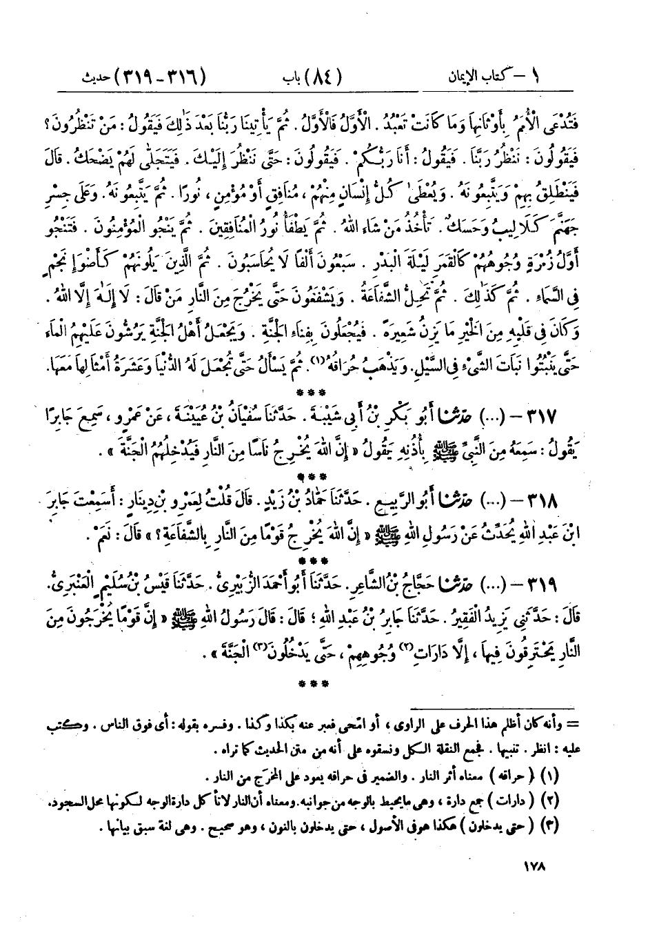 317 - (191) حَدَّثَنَا أَبُو بَكْرِ بْنُ أَبِي شَيْبَةَ، حَدَّثَنَا سُفْيَانُ بْنُ عُيَيْنَةَ، عَنْ عَمْرٍو، سَمِعَ جَابِرًا، يَقُولُ: سَمِعَهُ مِنَ النَّبِيِّ صَلَّى اللهُ عَلَيْهِ وَسَلَّمَ بِأُذُنِهِ، يَقُولُ: «إِنَّ §اللهَ يُخْرِجُ نَاسًا مِنَ النَّارِ فَيُدْخِلَهُمُ الْجَنَّةَ»