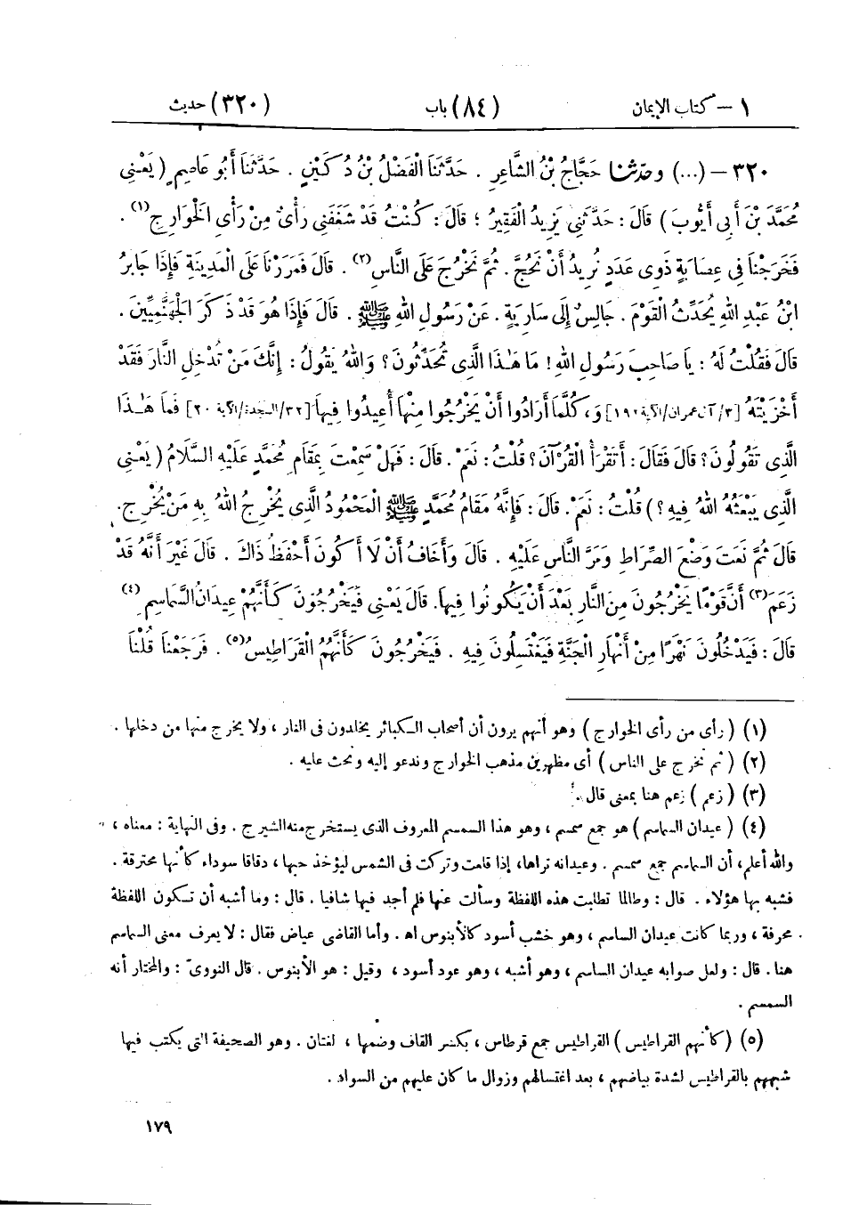 320 - (191) وَحَدَّثَنَا حَجَّاجُ بْنُ الشَّاعِرِ، حَدَّثَنَا الْفَضْلُ بْنُ دُكَيْنٍ، حَدَّثَنَا أَبُو عَاصِمٍ، يَعْنِي مُحَمَّدَ بْنَ أَبِي أَيُّوبَ، قَالَ: حَدَّثَنِي يَزِيدُ الْفَقِيرُ، قَالَ: كُنْتُ قَدْ شَغَفَنِي رَأْيٌ مِنْ رَأْيِ الْخَوَارِجِ، فَخَرَجْنَا فِي عِصَابَةٍ ذَوِي عَدَدٍ نُرِيدُ أَنْ نَحُجَّ، ثُمَّ نَخْرُجَ عَلَى النَّاسِ، قَالَ: فَمَرَرْنَا عَلَى الْمَدِينَةِ، فَإِذَا جَابِرُ بْنُ عَبْدِ اللهِ يُحَدِّثُ الْقَوْمَ، جَالِسٌ إِلَى سَارِيَةٍ، عَنْ رَسُولِ اللهِ صَلَّى اللهُ عَلَيْهِ وَسَلَّمَ قَالَ: فَإِذَا هُوَ قَدْ ذَكَرَ الْجَهَنَّمِيِّينَ، قَالَ: فَقُلْتُ لَهُ: يَا صَاحِبَ رَسُولِ اللهِ، مَا هَذَا الَّذِي تُحَدِّثُونَ؟ وَاللهُ يَقُولُ: {إِنَّكَ مَنْ تُدْخِلِ النَّارَ فَقَدْ أَخْزَيْتَهُ} [آل عمران: 192] وَ {كُلَّمَا أَرَادُوا أَنْ يَخْرُجُوا مِنْهَا أُعِيدُوا فِيهَا} [السجدة: 20]، فَمَا هَذَا الَّذِي تَقُولُونَ؟ قَالَ: فَقَالَ: «أَتَقْرَأُ الْقُرْآنَ؟» قُلْتُ: نَعَمْ، قَالَ: «فَهَلْ سَمِعْتَ بِمَقَامِ مُحَمَّدٍ عَلَيْهِ السَّلَامُ - يَعْنِي الَّذِي يَبْعَثُهُ اللهُ فِيهِ -؟» قُلْتُ: نَعَمْ، قَالَ: «§فَإِنَّهُ مَقَامُ مُحَمَّدٍ صَلَّى اللهُ عَلَيْهِ وَسَلَّمَ الْمَحْمُودُ الَّذِي يُخْرِجُ اللهُ بِهِ مَنْ يُخْرِجُ»، قَالَ: ثُمَّ نَعَتَ وَضْعَ الصِّرَاطِ، وَمَرَّ النَّاسِ عَلَيْهِ، - قَالَ: وَأَخَافُ أَنْ لَا أَكُونَ أَحْفَظُ ذَاكَ - قَالَ: غَيْرَ أَنَّهُ قَدْ زَعَمَ أَنَّ قَوْمًا يَخْرُجُونَ مِنَ النَّارِ بَعْدَ أَنْ يَكُونُوا فِيهَا، قَالَ: - يَعْنِي - فَيَخْرُجُونَ كَأَنَّهُمْ عِيدَانُ السَّمَاسِمِ، قَالَ: «فَيَدْخُلُونَ نَهَرًا مِنْ أَنْهَارِ الْجَنَّةِ، فَيَغْتَسِلُونَ فِيهِ، فَيَخْرُجُونَ كَأَنَّهُمُ الْقَرَاطِيسُ»، فَرَجَعْنَا قُلْنَا: وَيْحَكُمْ أَتُرَوْنَ الشَّيْخَ يَكْذِبُ عَلَى رَسُولِ اللهِ صَلَّى اللهُ عَلَيْهِ وَسَلَّمَ؟ فَرَجَعْنَا فَلَا وَاللهِ مَا خَرَجَ مِنَّا غَيْرُ رَجُلٍ وَاحِدٍ، أَوْ كَمَا قَالَ: أَبُو نُعَيْمٍ