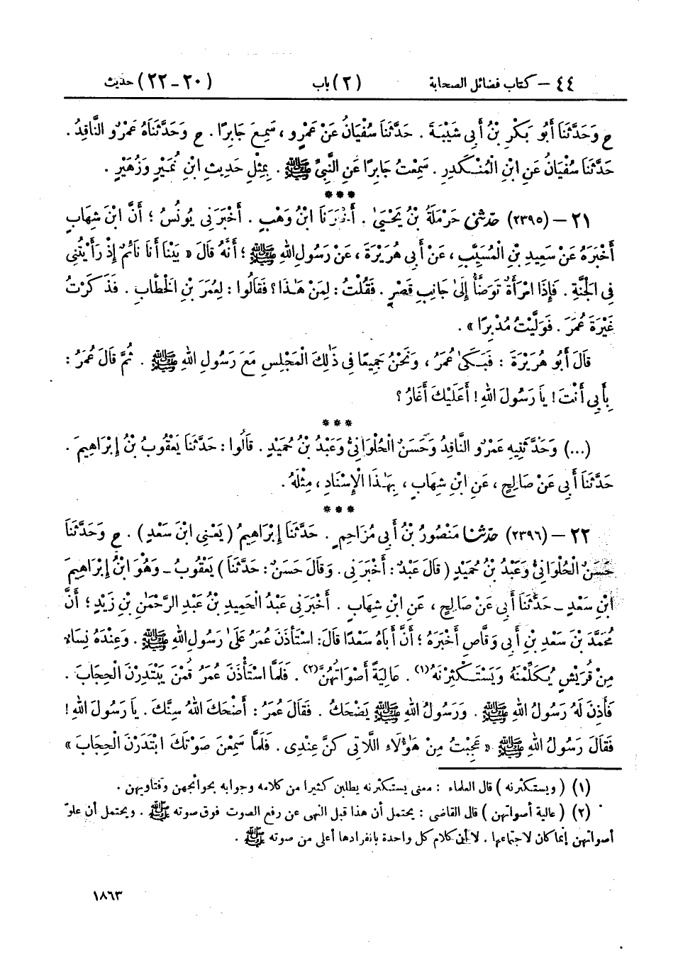 21 - (2395) حَدَّثَنِي حَرْمَلَةُ بْنُ يَحْيَى، أَخْبَرَنَا ابْنُ وَهْبٍ، أَخْبَرَنِي يُونُسُ، أَنَّ ابْنَ شِهَابٍ، أَخْبَرَهُ عَنْ سَعِيدِ بْنِ الْمُسَيِّبِ، عَنْ أَبِي هُرَيْرَةَ، عَنْ رَسُولِ اللهِ صَلَّى اللهُ عَلَيْهِ وَسَلَّمَ، أَنَّهُ قَالَ: " §بَيْنَا أَنَا نَائِمٌ إِذْ رَأَيْتُنِي فِي الْجَنَّةِ، فَإِذَا امْرَأَةٌ تَوَضَّأُ إِلَى جَانِبِ قَصْرٍ، فَقُلْتُ: لِمَنْ هَذَا؟ فَقَالُوا: لِعُمَرَ بْنِ الْخَطَّابِ، فَذَكَرْتُ غَيْرَةَ عُمَرَ، فَوَلَّيْتُ مُدْبِرًا " قَالَ أَبُو هُرَيْرَةَ فَبَكَى عُمَرُ، وَنَحْنُ جَمِيعًا فِي ذَلِكَ الْمَجْلِسِ مَعَ رَسُولِ اللهِ صَلَّى اللهُ عَلَيْهِ وَسَلَّمَ، ثُمَّ قَالَ عُمَرُ: بِأَبِي أَنْتَ يَا رَسُولَ اللهِ أَعَلَيْكَ أَغَارُ؟