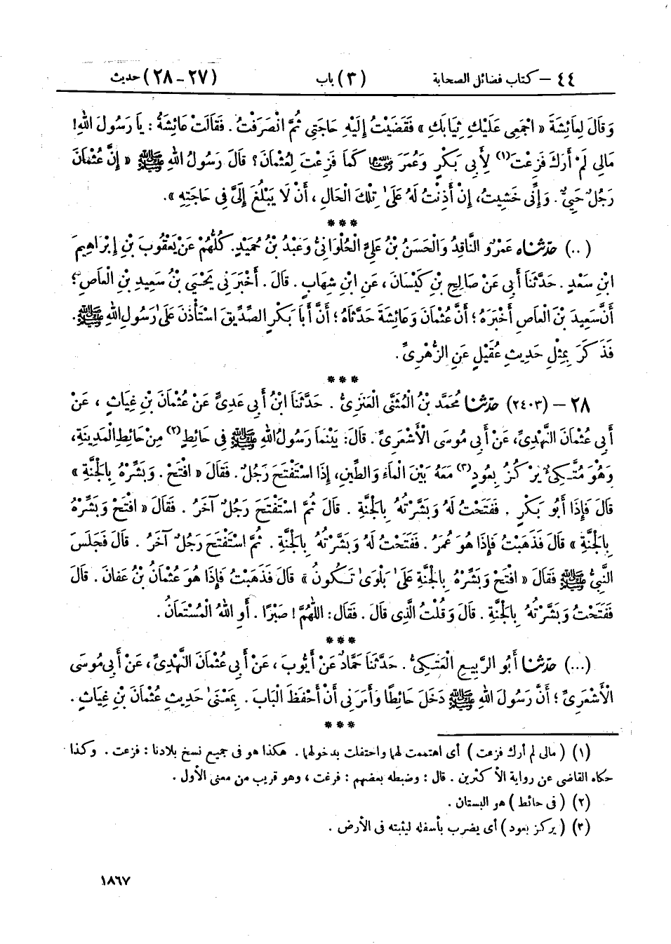 28 - (2403) حَدَّثَنَا مُحَمَّدُ بْنُ الْمُثَنَّى الْعَنَزِيُّ، حَدَّثَنَا ابْنُ أَبِي عَدِيٍّ، عَنْ عُثْمَانَ بْنِ غِيَاثٍ، عَنْ أَبِي عُثْمَانَ النَّهْدِيِّ، عَنْ أَبِي مُوسَى الْأَشْعَرِيِّ، قَالَ: بَيْنَمَا رَسُولُ اللهِ صَلَّى اللهُ عَلَيْهِ وَسَلَّمَ، فِي حَائِطٍ مِنْ حَائِطِ الْمَدِينَةِ وَهُوَ مُتَّكِئٌ يَرْكُزُ بِعُودٍ مَعَهُ بَيْنَ الْمَاءِ وَالطِّينِ، إِذَا اسْتَفْتَحَ رَجُلٌ، فَقَالَ: «§افْتَحْ وَبَشِّرْهُ بِالْجَنَّةِ» قَالَ: فَإِذَا أَبُو بَكْرٍ، فَفَتَحْتُ لَهُ وَبَشَّرْتُهُ بِالْجَنَّةِ، قَالَ ثُمَّ اسْتَفْتَحَ رَجُلٌ آخَرُ، فَقَالَ: «افْتَحْ وَبَشِّرْهُ بِالْجَنَّةِ» قَالَ: فَذَهَبْتُ فَإِذَا هُوَ عُمَرُ، فَفَتَحْتُ لَهُ وَبَشَّرْتُهُ بِالْجَنَّةِ، ثُمَّ اسْتَفْتَحَ رَجُلٌ آخَرُ، قَالَ فَجَلَسَ النَّبِيُّ صَلَّى اللهُ عَلَيْهِ وَسَلَّمَ فَقَالَ: «افْتَحْ وَبَشِّرْهُ بِالْجَنَّةِ عَلَى بَلْوَى تَكُونُ» قَالَ: فَذَهَبْتُ فَإِذَا هُوَ عُثْمَانُ بْنُ عَفَّانَ، قَالَ: فَفَتَحْتُ وَبَشَّرْتُهُ بِالْجَنَّةِ، قَالَ وَقُلْتُ الَّذِي قَالَ، فَقَالَ: اللهُمَّ صَبْرًا، أَوِ اللهُ الْمُسْتَعَانُ
