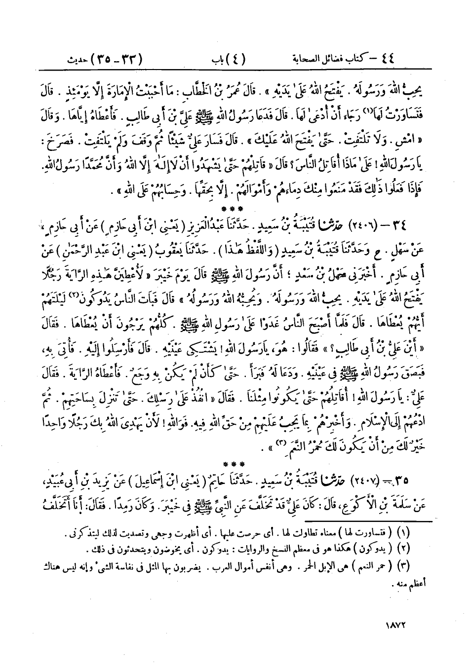 34 - (2406) حَدَّثَنَا قُتَيْبَةُ بْنُ سَعِيدٍ، حَدَّثَنَا عَبْدُ الْعَزِيزِ يَعْنِي ابْنَ أَبِي حَازِمٍ، عَنْ أَبِي حَازِمٍ، عَنْ سَهْلٍ، ح وَحَدَّثَنَا قُتَيْبَةُ بْنُ سَعِيدٍ - وَاللَّفْظُ هَذَا - حَدَّثَنَا يَعْقُوبُ يَعْنِي ابْنَ عَبْدِ الرَّحْمَنِ، عَنْ أَبِي حَازِمٍ، أَخْبَرَنِي سَهْلُ بْنُ سَعْدٍ، أَنَّ رَسُولَ اللهِ صَلَّى اللهُ عَلَيْهِ وَسَلَّمَ، قَالَ يَوْمَ خَيْبَرَ: «§لَأُعْطِيَنَّ هَذِهِ الرَّايَةَ رَجُلًا يَفْتَحُ اللهُ عَلَى يَدَيْهِ، يُحِبُّ اللهَ وَرَسُولَهُ وَيُحِبُّهُ اللهُ وَرَسُولُهُ» قَالَ: فَبَاتَ النَّاسُ يَدُوكُونَ لَيْلَتَهُمْ أَيُّهُمْ يُعْطَاهَا، قَالَ فَلَمَّا أَصْبَحَ النَّاسُ غَدَوْا عَلَى رَسُولِ اللهِ صَلَّى اللهُ عَلَيْهِ وَسَلَّمَ، كُلُّهُمْ يَرْجُونَ أَنْ يُعْطَاهَا، فَقَالَ أَيْنَ عَلِيُّ بْنُ أَبِي طَالِبٍ فَقَالُوا: هُوَ يَا رَسُولَ اللهِ يَشْتَكِي عَيْنَيْهِ، قَالَ فَأَرْسِلُوا إِلَيْهِ، فَأُتِيَ بِهِ، فَبَصَقَ رَسُولُ اللهِ صَلَّى اللهُ عَلَيْهِ وَسَلَّمَ فِي عَيْنَيْهِ، وَدَعَا لَهُ فَبَرَأَ، حَتَّى كَأَنْ لَمْ يَكُنْ بِهِ وَجَعٌ، فَأَعْطَاهُ الرَّايَةَ، فَقَالَ عَلِيٌّ: يَا رَسُولَ اللهِ أُقَاتِلُهُمْ حَتَّى يَكُونُوا مِثْلَنَا، فَقَالَ: «انْفُذْ عَلَى رِسْلِكَ، حَتَّى تَنْزِلَ بِسَاحَتِهِمْ، ثُمَّ ادْعُهُمْ إِلَى الْإِسْلَامِ، وَأَخْبِرْهُمْ بِمَا يَجِبُ عَلَيْهِمْ مِنْ حَقِّ اللهِ فِيهِ، فَوَاللهِ لَأَنْ يَهْدِيَ اللهُ بِكَ رَجُلًا وَاحِدًا خَيْرٌ لَكَ مِنْ أَنْ يَكُونَ لَكَ حُمْرُ النَّعَمِ»