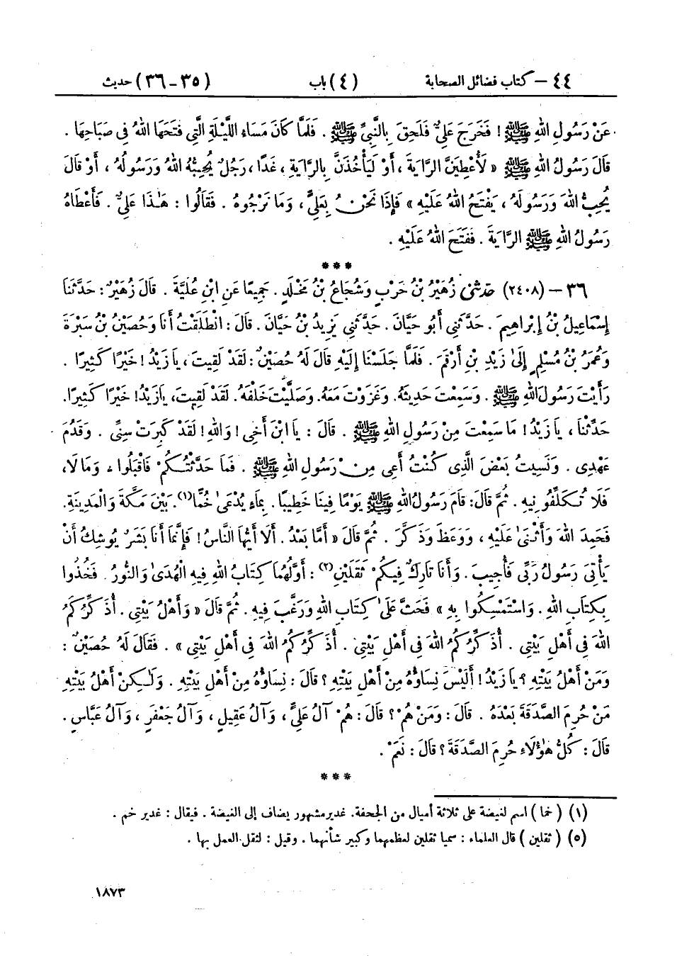 36 - (2408) حَدَّثَنِي زُهَيْرُ بْنُ حَرْبٍ، وَشُجَاعُ بْنُ مَخْلَدٍ، جَمِيعًا عَنِ ابْنِ عُلَيَّةَ، قَالَ زُهَيْرٌ: حَدَّثَنَا إِسْمَاعِيلُ بْنُ إِبْرَاهِيمَ، حَدَّثَنِي أَبُو حَيَّانَ، حَدَّثَنِي يَزِيدُ بْنُ حَيَّانَ، قَالَ: انْطَلَقْتُ أَنَا وَحُصَيْنُ بْنُ سَبْرَةَ، وَعُمَرُ بْنُ مُسْلِمٍ، إِلَى زَيْدِ بْنِ أَرْقَمَ، فَلَمَّا جَلَسْنَا إِلَيْهِ قَالَ لَهُ حُصَيْنٌ: لَقَدْ لَقِيتَ يَا زَيْدُ خَيْرًا كَثِيرًا، رَأَيْتَ رَسُولَ اللهِ صَلَّى اللهُ عَلَيْهِ وَسَلَّمَ، وَسَمِعْتَ حَدِيثَهُ، وَغَزَوْتَ مَعَهُ، وَصَلَّيْتَ خَلْفَهُ لَقَدْ لَقِيتَ، يَا زَيْدُ خَيْرًا كَثِيرًا، حَدِّثْنَا يَا زَيْدُ مَا سَمِعْتَ مِنْ رَسُولِ اللهِ صَلَّى اللهُ عَلَيْهِ وَسَلَّمَ، قَالَ: يَا ابْنَ أَخِي وَاللهِ لَقَدْ كَبِرَتْ سِنِّي، وَقَدُمَ عَهْدِي، وَنَسِيتُ بَعْضَ الَّذِي كُنْتُ أَعِي مِنْ رَسُولِ اللهِ صَلَّى اللهُ عَلَيْهِ وَسَلَّمَ، فَمَا حَدَّثْتُكُمْ فَاقْبَلُوا، وَمَا لَا، فَلَا تُكَلِّفُونِيهِ، ثُمَّ قَالَ: قَامَ رَسُولُ اللهِ صَلَّى اللهُ عَلَيْهِ وَسَلَّمَ يَوْمًا فِينَا خَطِيبًا، بِمَاءٍ يُدْعَى خُمًّا بَيْنَ مَكَّةَ وَالْمَدِينَةِ فَحَمِدَ اللهَ وَأَثْنَى عَلَيْهِ، وَوَعَظَ وَذَكَّرَ، ثُمَّ قَالَ: " أَمَّا بَعْدُ، أَلَا أَيُّهَا النَّاسُ فَإِنَّمَا §أَنَا بَشَرٌ يُوشِكُ أَنْ يَأْتِيَ رَسُولُ رَبِّي فَأُجِيبَ، وَأَنَا تَارِكٌ فِيكُمْ ثَقَلَيْنِ: أَوَّلُهُمَا كِتَابُ اللهِ فِيهِ الْهُدَى وَالنُّورُ فَخُذُوا بِكِتَابِ اللهِ، وَاسْتَمْسِكُوا بِهِ " فَحَثَّ عَلَى كِتَابِ اللهِ وَرَغَّبَ فِيهِ، ثُمَّ قَالَ: «وَأَهْلُ بَيْتِي أُذَكِّرُكُمُ اللهَ فِي أَهْلِ بَيْتِي، أُذَكِّرُكُمُ اللهَ فِي أَهْلِ بَيْتِي، أُذَكِّرُكُمُ اللهَ فِي أَهْلِ بَيْتِي» فَقَالَ لَهُ حُصَيْنٌ: وَمَنْ أَهْلُ بَيْتِهِ؟ يَا زَيْدُ أَلَيْسَ نِسَاؤُهُ مِنْ أَهْلِ بَيْتِهِ؟ قَالَ: نِسَاؤُهُ مِنْ أَهْلِ بَيْتِهِ، وَلَكِنْ أَهْلُ بَيْتِهِ مَنْ حُرِمَ الصَّدَقَةَ بَعْدَهُ، قَالَ: وَمَنْ هُمْ؟ قَالَ: هُمْ آلُ عَلِيٍّ وَآلُ عَقِيلٍ، وَآلُ جَعْفَرٍ، وَآلُ عَبَّاسٍ قَالَ: كُلُّ هَؤُلَاءِ حُرِمَ الصَّدَقَةَ؟ قَالَ: نَعَمْ