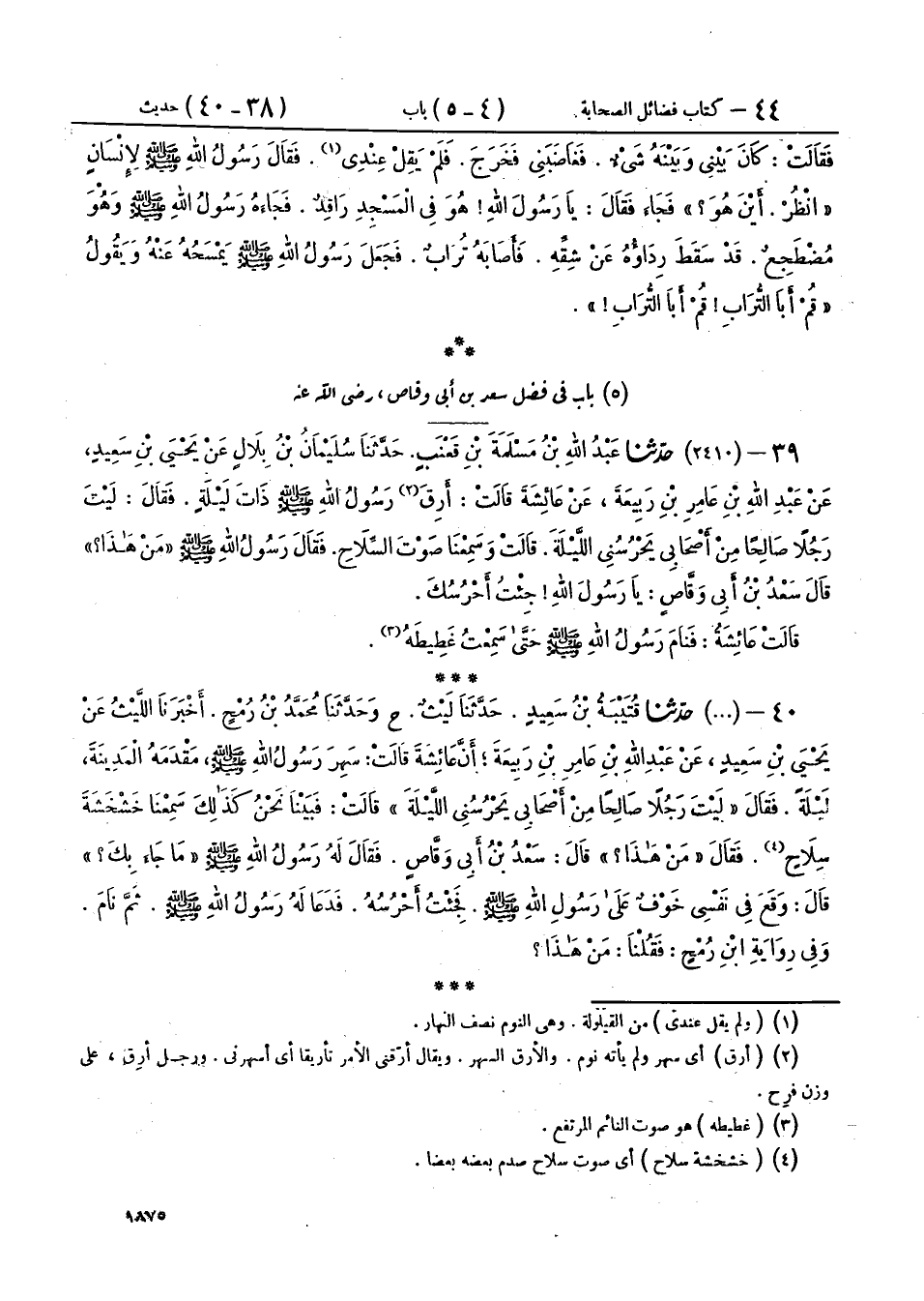 39 - (2410) حَدَّثَنَا عَبْدُ اللهِ بْنُ مَسْلَمَةَ بْنِ قَعْنَبٍ، حَدَّثَنَا سُلَيْمَانُ بْنُ بِلَالٍ، عَنْ يَحْيَى بْنِ سَعِيدٍ، عَنْ عَبْدِ اللهِ بْنِ عَامِرِ بْنِ رَبِيعَةَ، عَنْ عَائِشَةَ، قَالَتْ: أَرِقَ رَسُولُ اللهِ صَلَّى اللهُ عَلَيْهِ وَسَلَّمَ، ذَاتَ لَيْلَةٍ، فَقَالَ: «لَيْتَ رَجُلًا صَالِحًا مِنْ أَصْحَابِي يَحْرُسُنِي اللَّيْلَةَ»، قَالَتْ وَسَمِعْنَا صَوْتَ السِّلَاحِ، فَقَالَ رَسُولُ اللهِ صَلَّى اللهُ عَلَيْهِ وَسَلَّمَ: «§مَنْ هَذَا؟» قَالَ سَعْدُ بْنُ أَبِي وَقَّاصٍ: يَا رَسُولَ اللهِ جِئْتُ أَحْرُسُكَ. قَالَتْ عَائِشَةُ: فَنَامَ رَسُولُ اللهِ صَلَّى اللهُ عَلَيْهِ وَسَلَّمَ حَتَّى سَمِعْتُ غَطِيطَهُ