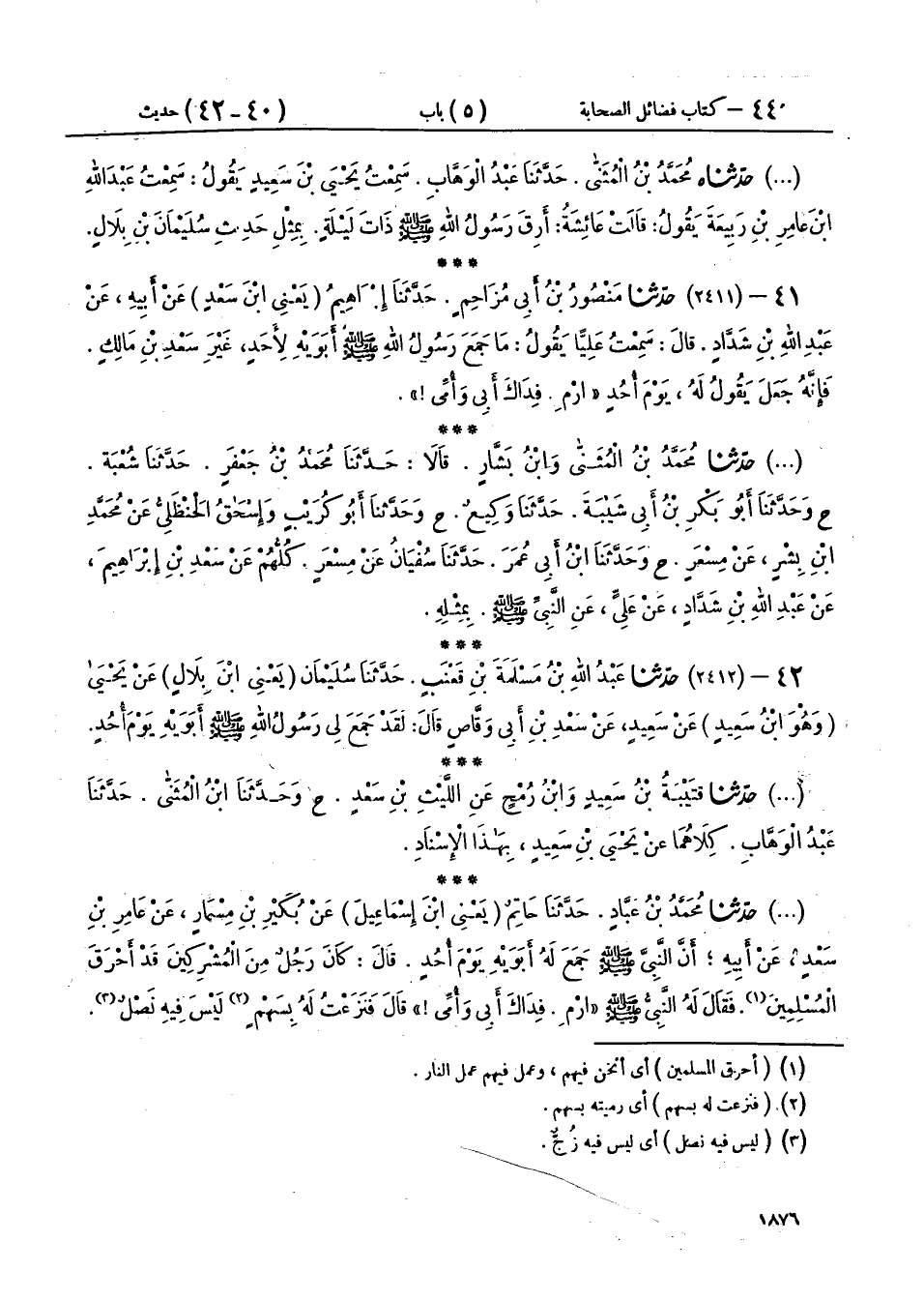 42 - حَدَّثَنَا مُحَمَّدُ بْنُ عَبَّادٍ، حَدَّثَنَا حَاتِمٌ يَعْنِي ابْنَ إِسْمَاعِيلَ، عَنْ بُكَيْرِ بْنِ مِسْمَارٍ، عَنْ عَامِرِ بْنِ سَعْدٍ، عَنْ أَبِيهِ، أَنَّ النَّبِيَّ صَلَّى اللهُ عَلَيْهِ وَسَلَّمَ جَمَعَ لَهُ أَبَوَيْهِ يَوْمَ أُحُدٍ قَالَ: كَانَ رَجُلٌ مِنَ الْمُشْرِكِينَ قَدْ أَحْرَقَ الْمُسْلِمِينَ، فَقَالَ لَهُ النَّبِيُّ صَلَّى اللهُ عَلَيْهِ وَسَلَّمَ: «§ارْمِ فِدَاكَ أَبِي وَأُمِّي» قَالَ فَنَزَعْتُ لَهُ بِسَهْمٍ لَيْسَ فِيهِ نَصْلٌ، فَأَصَبْتُ جَنْبَهُ فَسَقَطَ، فَانْكَشَفَتْ عَوْرَتُهُ فَضَحِكَ رَسُولُ اللهِ صَلَّى اللهُ عَلَيْهِ وَسَلَّمَ حَتَّى نَظَرْتُ إِلَى نَوَاجِذِهِ